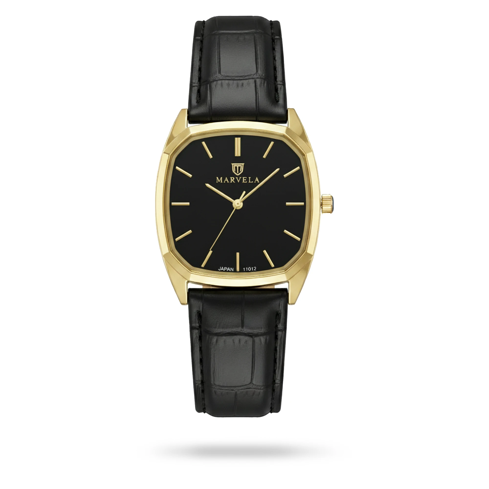 Marvela Watch For Men code MR11014G-0002 ,a beautiful wrist watch with 11014 Reference, is a Classic watch which has a Leather Strap, gives you an unique style. This watch has a Golden case, Black strap and a Black dial which has created a beautiful color combination.