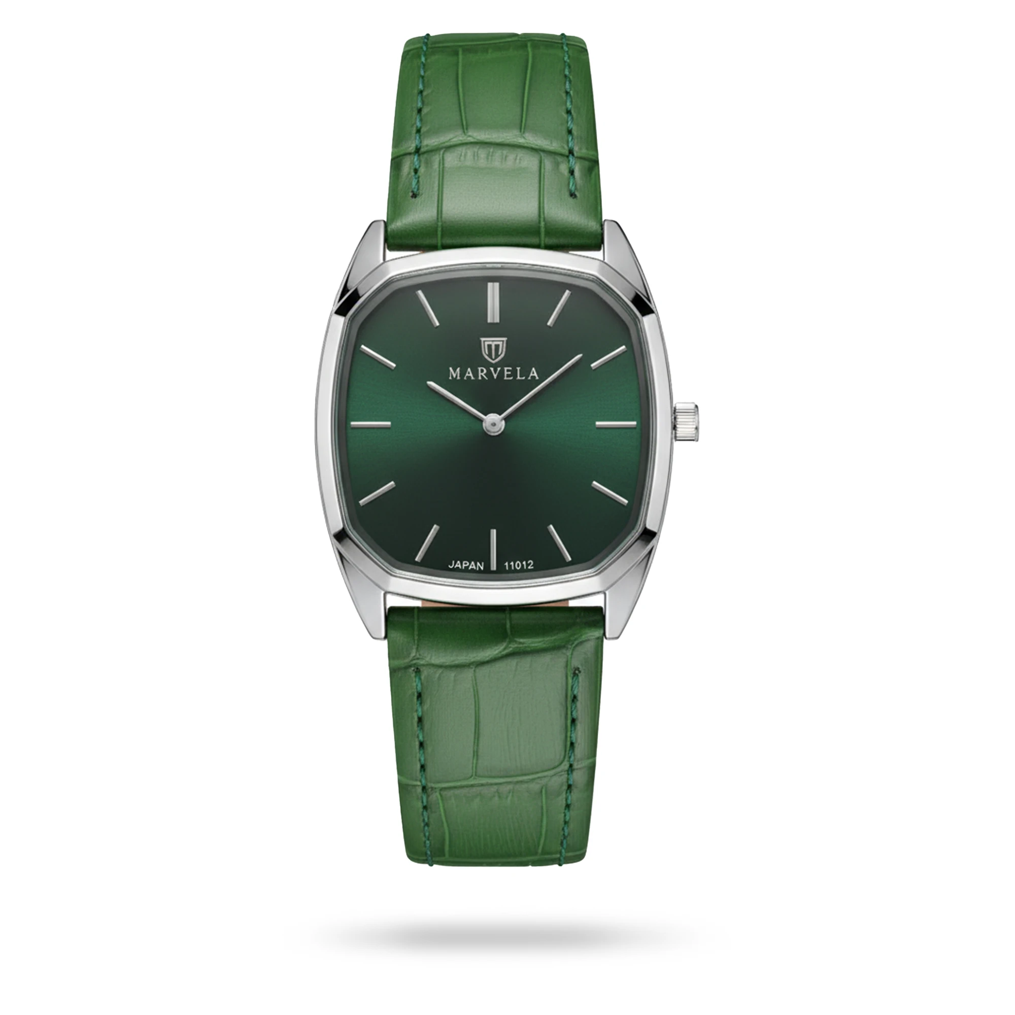 Marvela Watch For Men code MR11014G-0009 ,a beautiful wrist watch with 11014 Reference, is a Classic watch which has a Leather Strap, gives you an unique style. This watch has a Steel case, Green strap and a Green dial which has created a beautiful color combination.