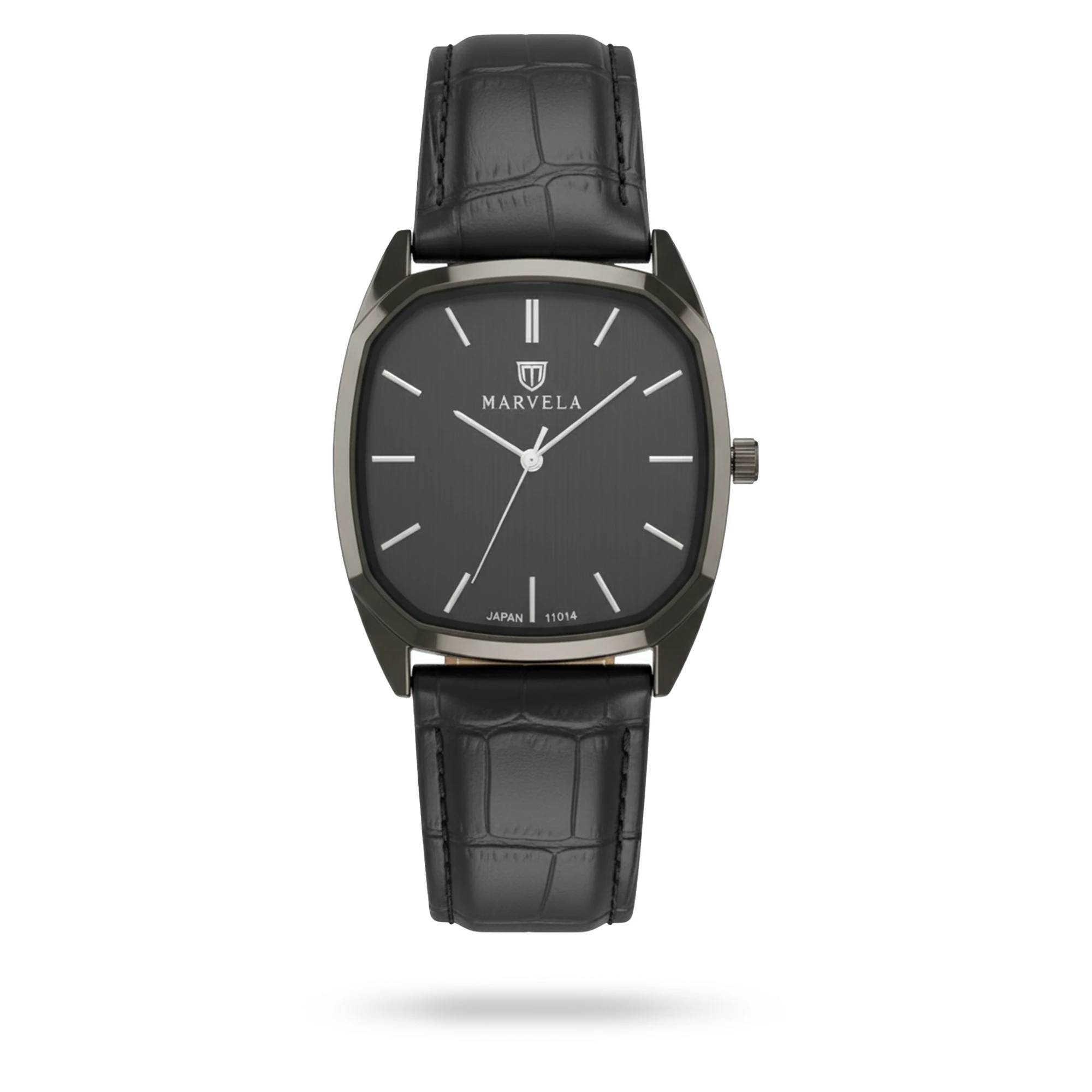 Marvela Watch For Men code MR11014G-0014 ,a beautiful wrist watch with 11014 Reference, is a Classic watch which has a Leather Strap, gives you an unique style. This watch has a Black case, Black strap and a Black dial which has created a beautiful color combination.