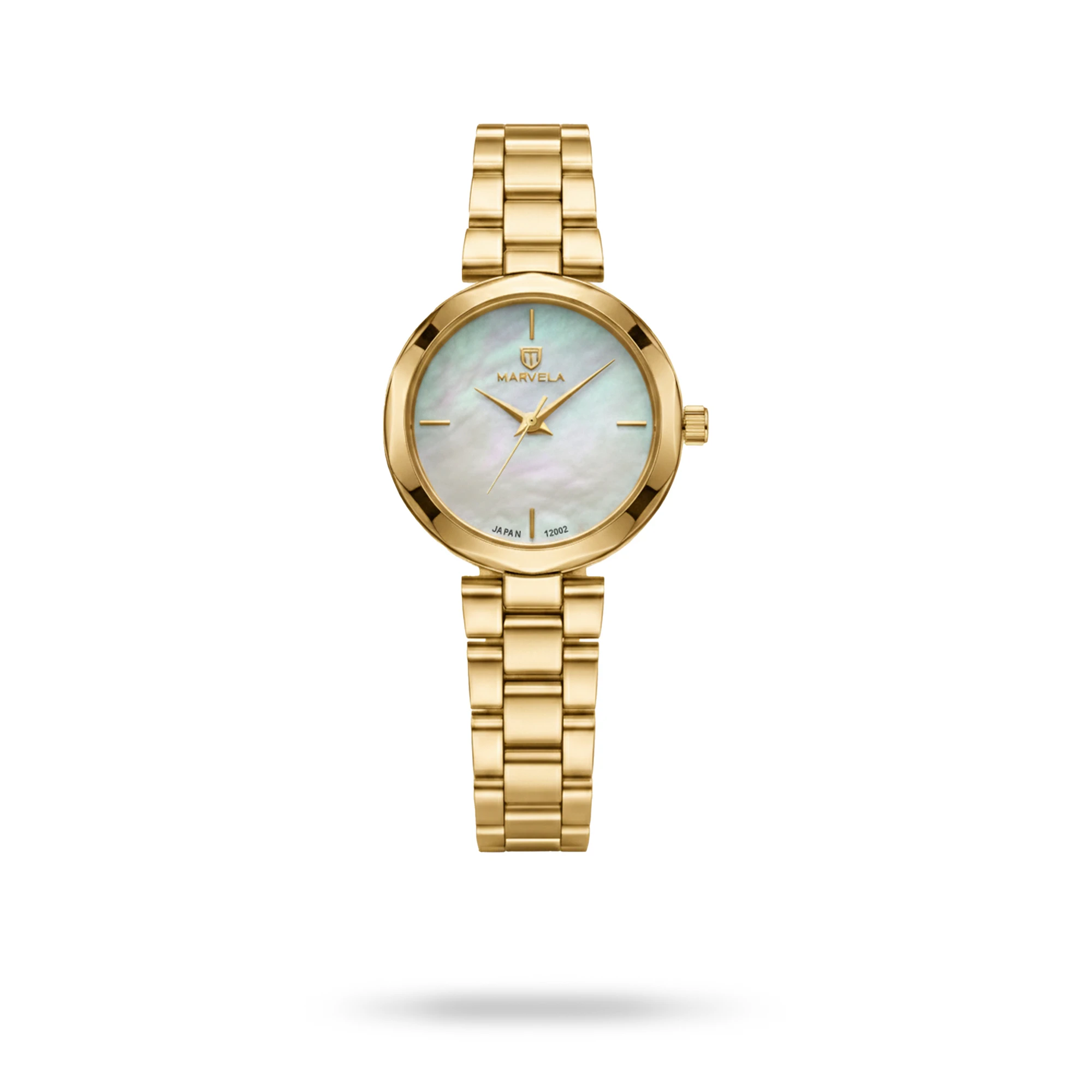 Marvela Watch For Women code MR12002L-0001 ,a beautiful wrist watch with 12002 Reference, is a Classic watch which has a Metallic Strap, gives you an unique style. This watch has a Golden case, Golden strap and a Silver dial which has created a beautiful color combination.