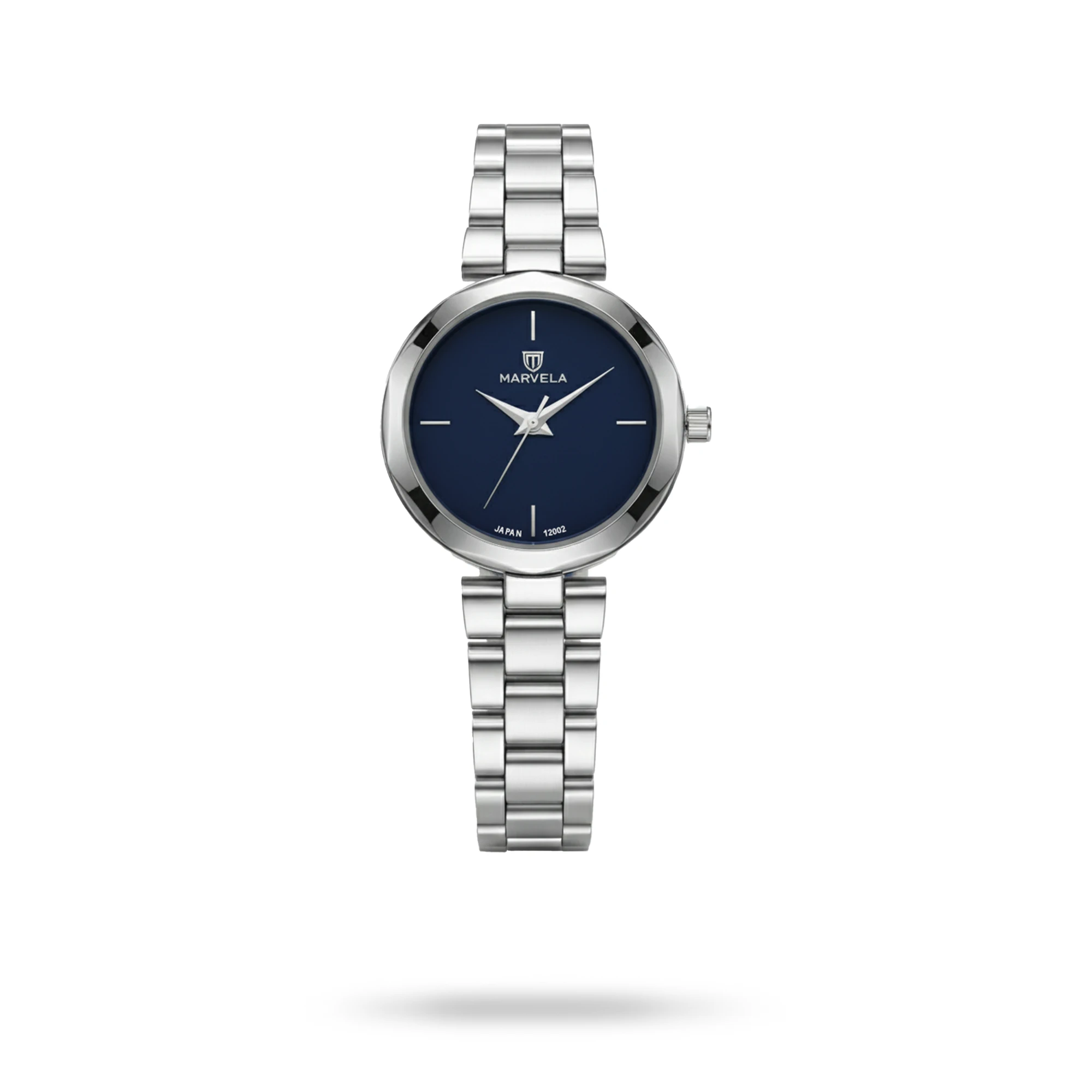 Marvela Watch For Women code MR12002L-0010 ,a beautiful wrist watch with 12002 Reference, is a Classic watch which has a Metallic Strap, gives you an unique style. This watch has a Steel case, Steel strap and a Dark Blue dial which has created a beautiful color combination.