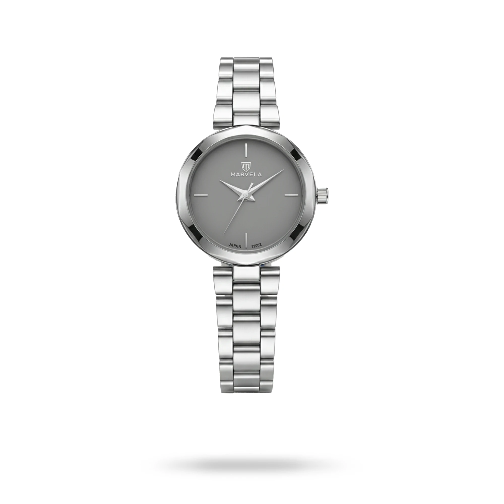 Marvela Watch For Women code MR12002L-0309 ,a beautiful wrist watch with 12002 Reference, is a Classic watch which has a Metallic Strap, gives you an unique style. This watch has a Steel case, Steel strap and a Gray dial which has created a beautiful color combination.