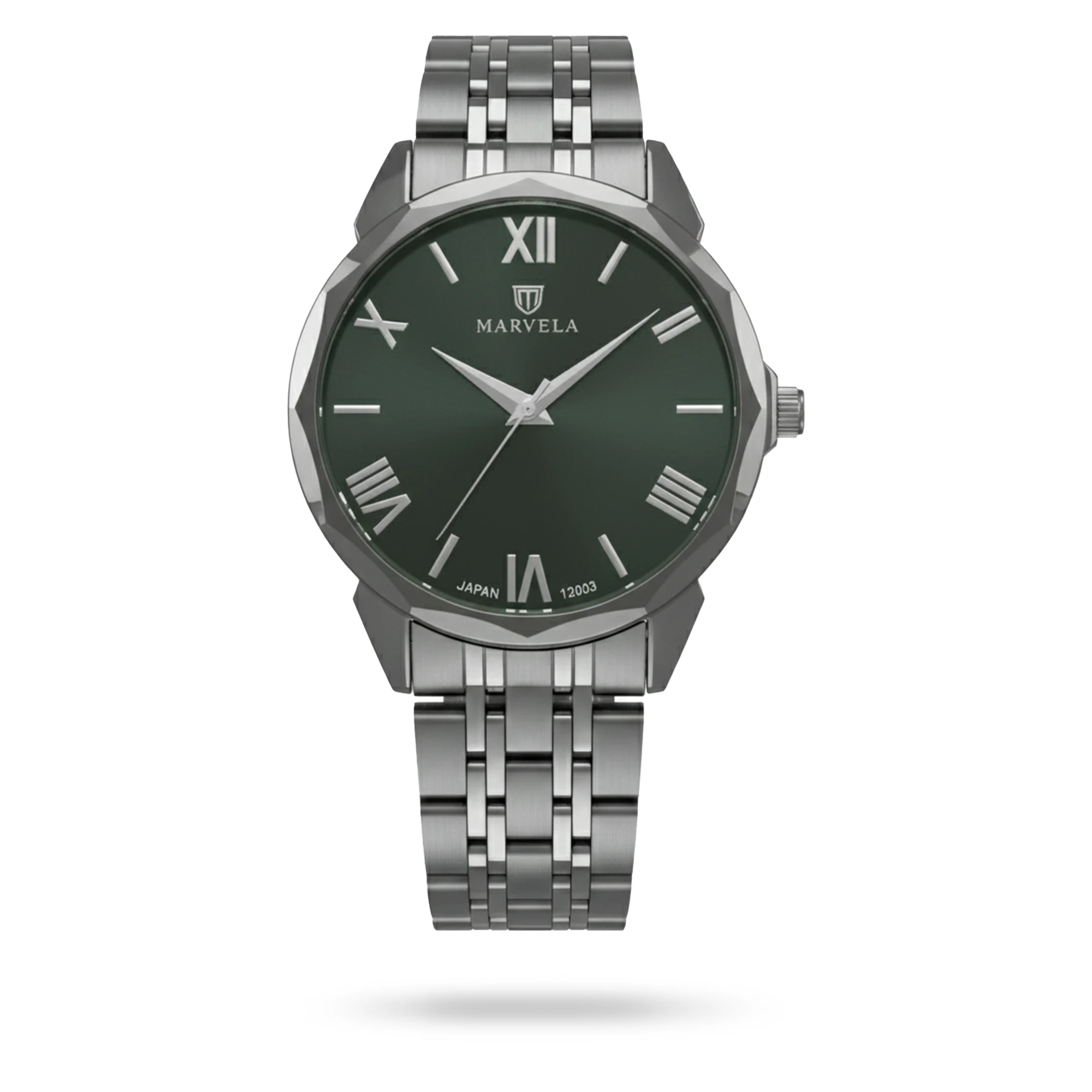 Marvela Watch For Men code MR12003G-0012 ,a beautiful wrist watch with 12003 Reference, is a Classic watch which has a Metallic Strap, gives you an unique style. This watch has a Smoke case, Smoke strap and a Green dial which has created a beautiful color combination.