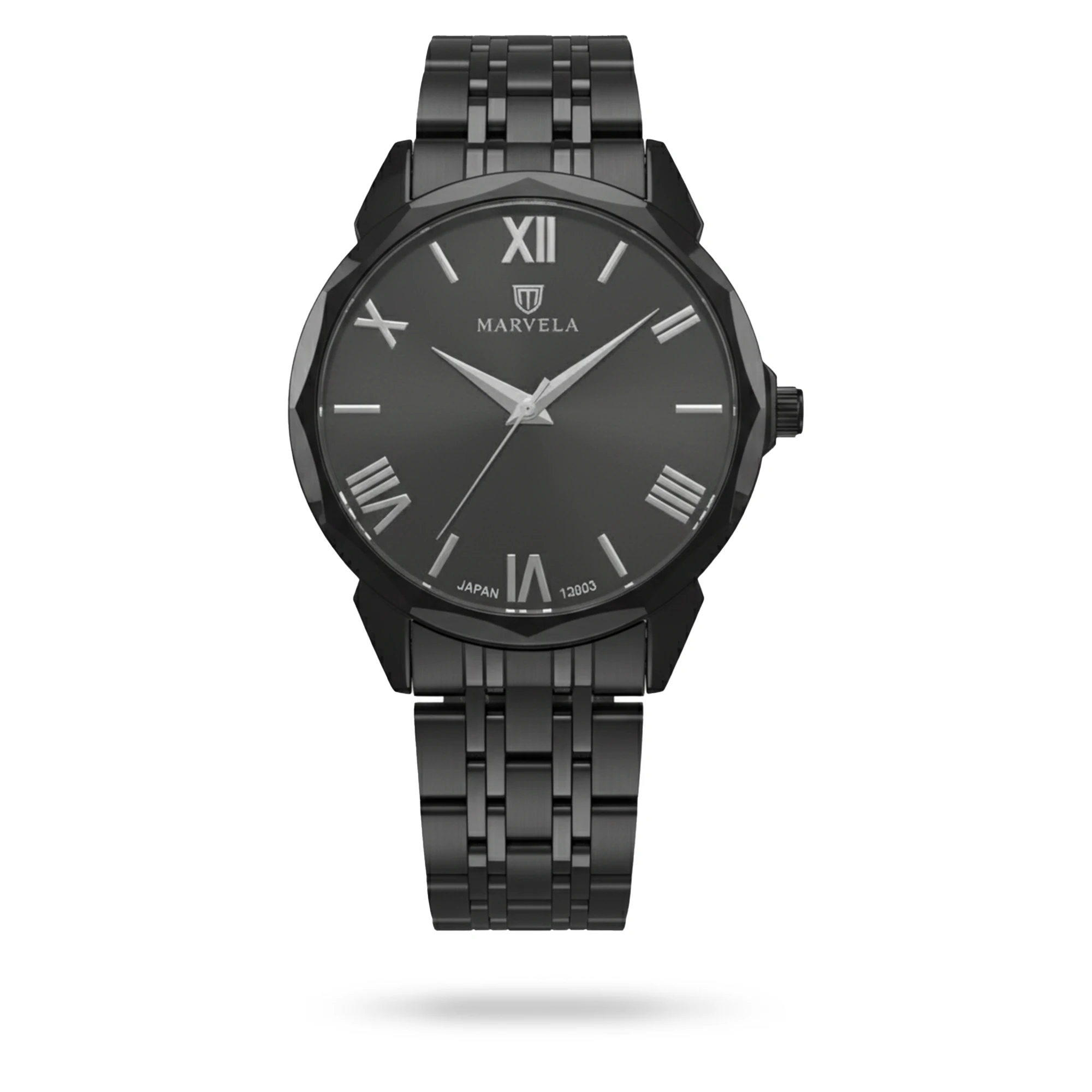 Marvela Watch For Men code MR12003G-0014 ,a beautiful wrist watch with 12003 Reference, is a Classic watch which has a Metallic Strap, gives you an unique style. This watch has a Black case, Black strap and a Black dial which has created a beautiful color combination.