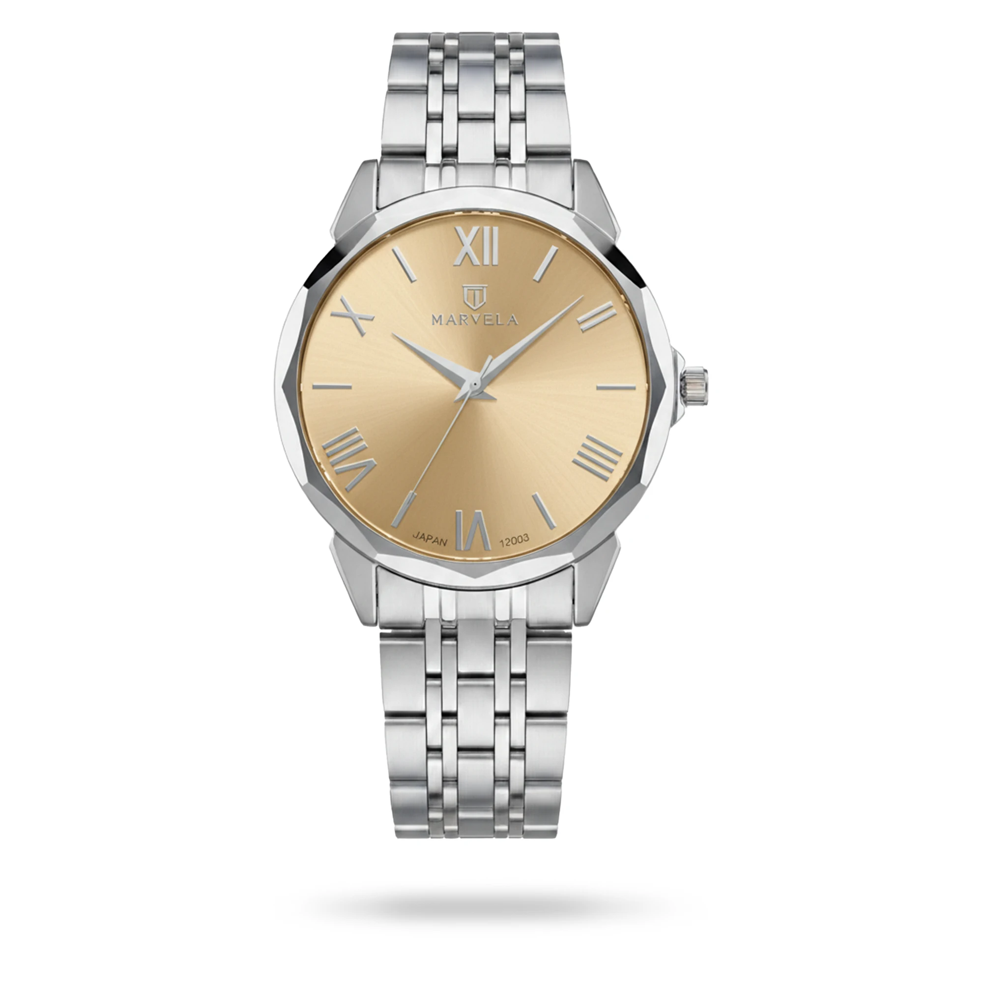 Marvela Watch For Men code MR12003G-0301 ,a beautiful wrist watch with 12003 Reference, is a Classic watch which has a Metallic Strap, gives you an unique style. This watch has a Steel case, Steel strap and a Yellow dial which has created a beautiful color combination.