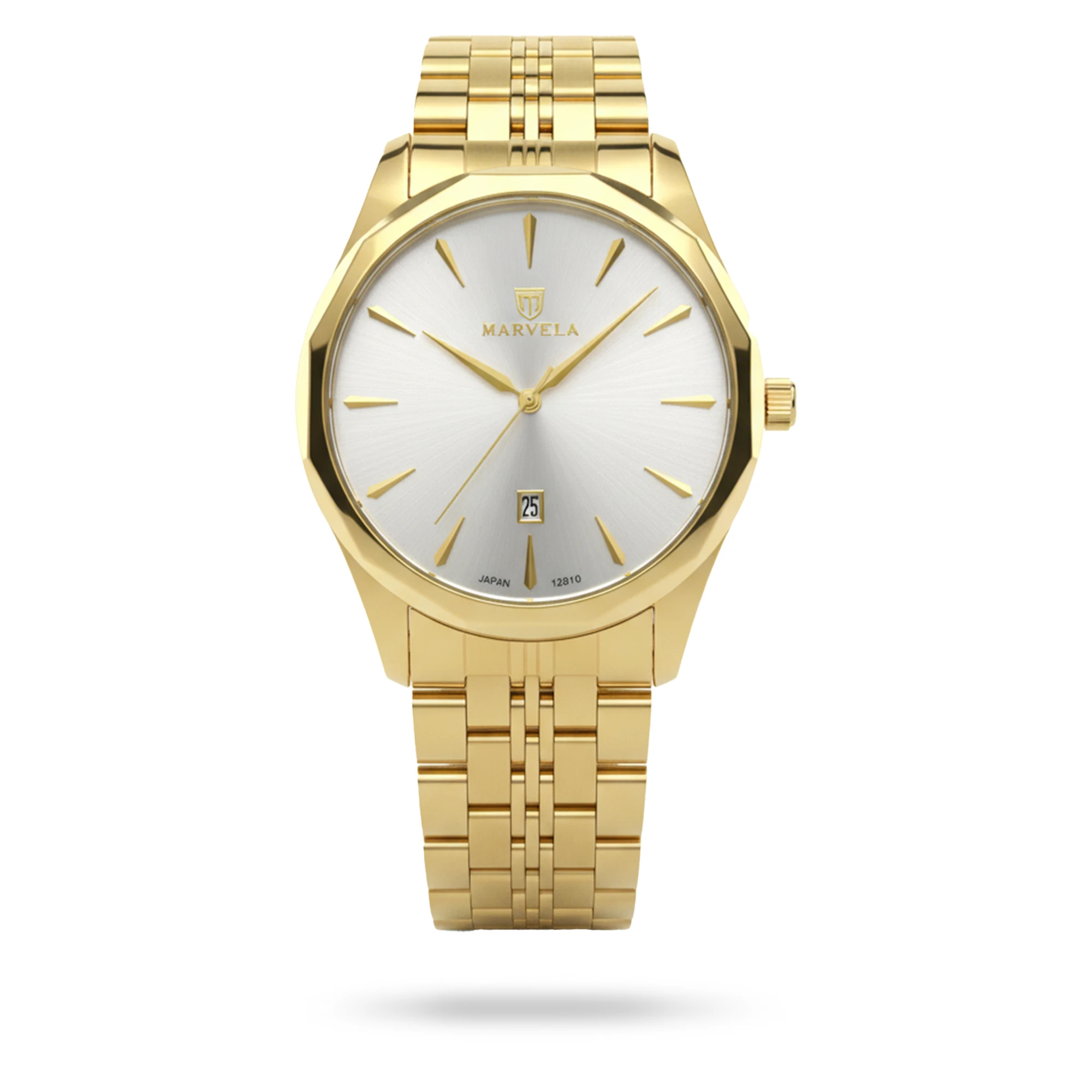 Marvela Watch For Men code MR12010G-0001 ,a beautiful wrist watch with 12010 Reference, is a Classic watch which has a Metallic Strap, gives you an unique style. This watch has a Golden case, Golden strap and a Silver dial which has created a beautiful color combination.