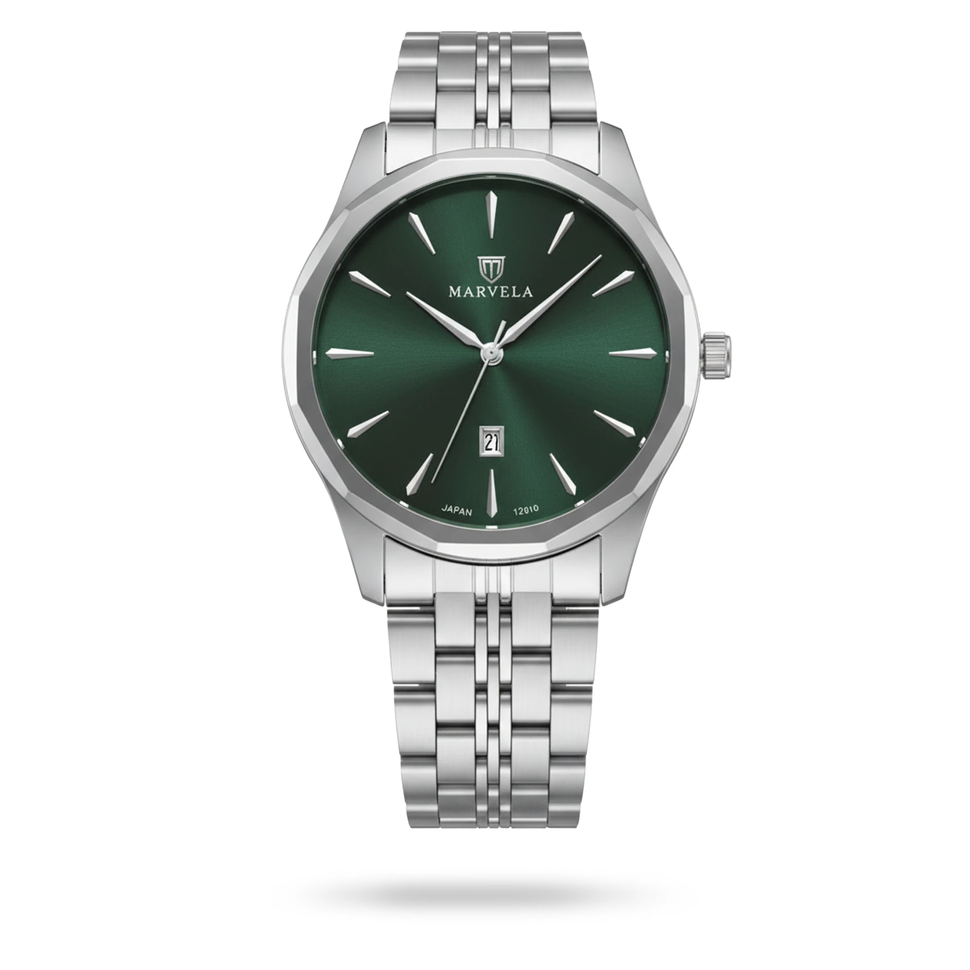 Marvela Watch For Men code MR12010G-0009 ,a beautiful wrist watch with 12010 Reference, is a Classic watch which has a Metallic Strap, gives you an unique style. This watch has a Steel case, Steel strap and a Green dial which has created a beautiful color combination.