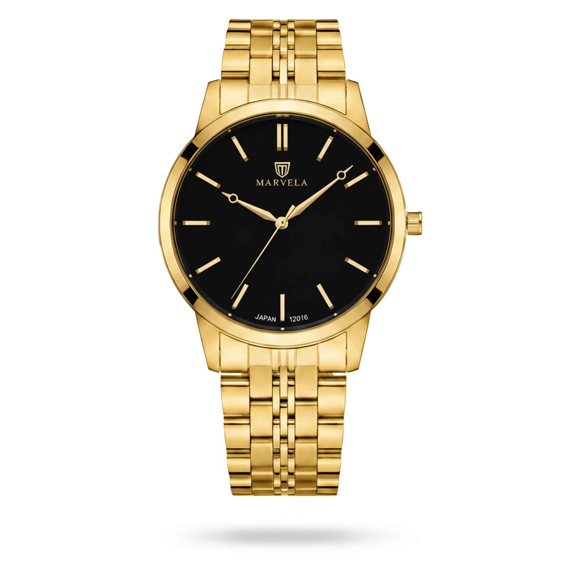 Marvela Watch For Men code MR12016G-0002 ,a beautiful wrist watch with 12016 Reference, is a Classic watch which has a Metallic Strap, gives you an unique style. This watch has a Golden case, Golden strap and a Black dial which has created a beautiful color combination.