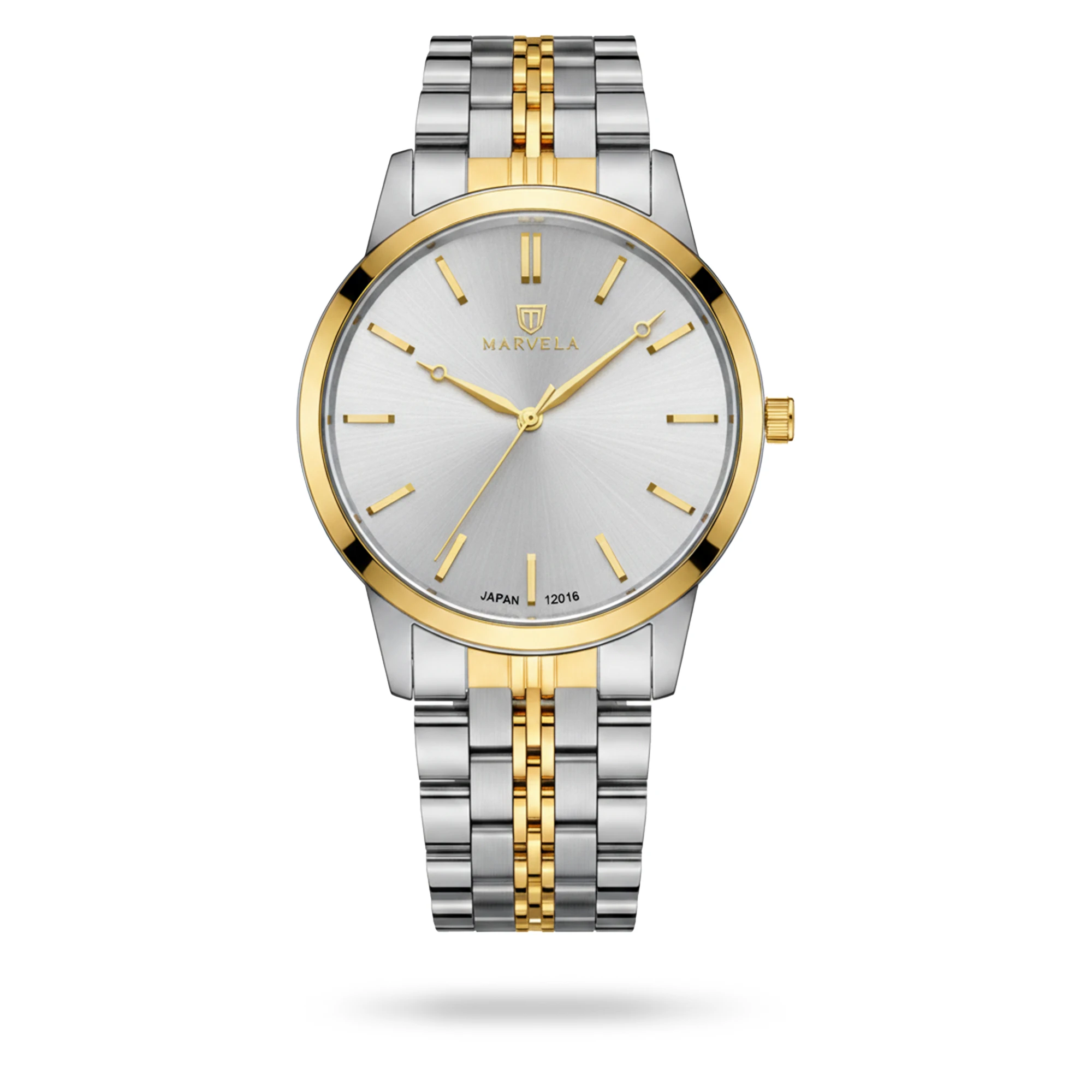 Marvela Watch For Men code MR12016G-0003 ,a beautiful wrist watch with 12016 Reference, is a Classic watch which has a Metallic Strap, gives you an unique style. This watch has a Golden Steel case, Golden Steel strap and a Silver dial which has created a beautiful color combination.