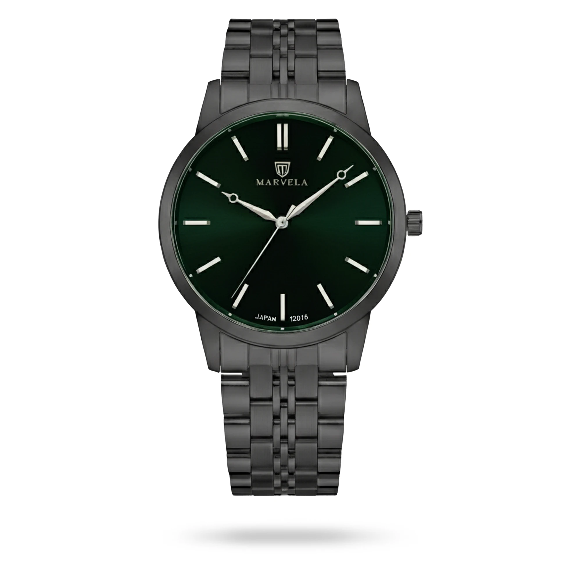 Marvela Watch For Men code MR12016G-0012 ,a beautiful wrist watch with 12016 Reference, is a Classic watch which has a Metallic Strap, gives you an unique style. This watch has a Smoke case, Smoke strap and a Green dial which has created a beautiful color combination.