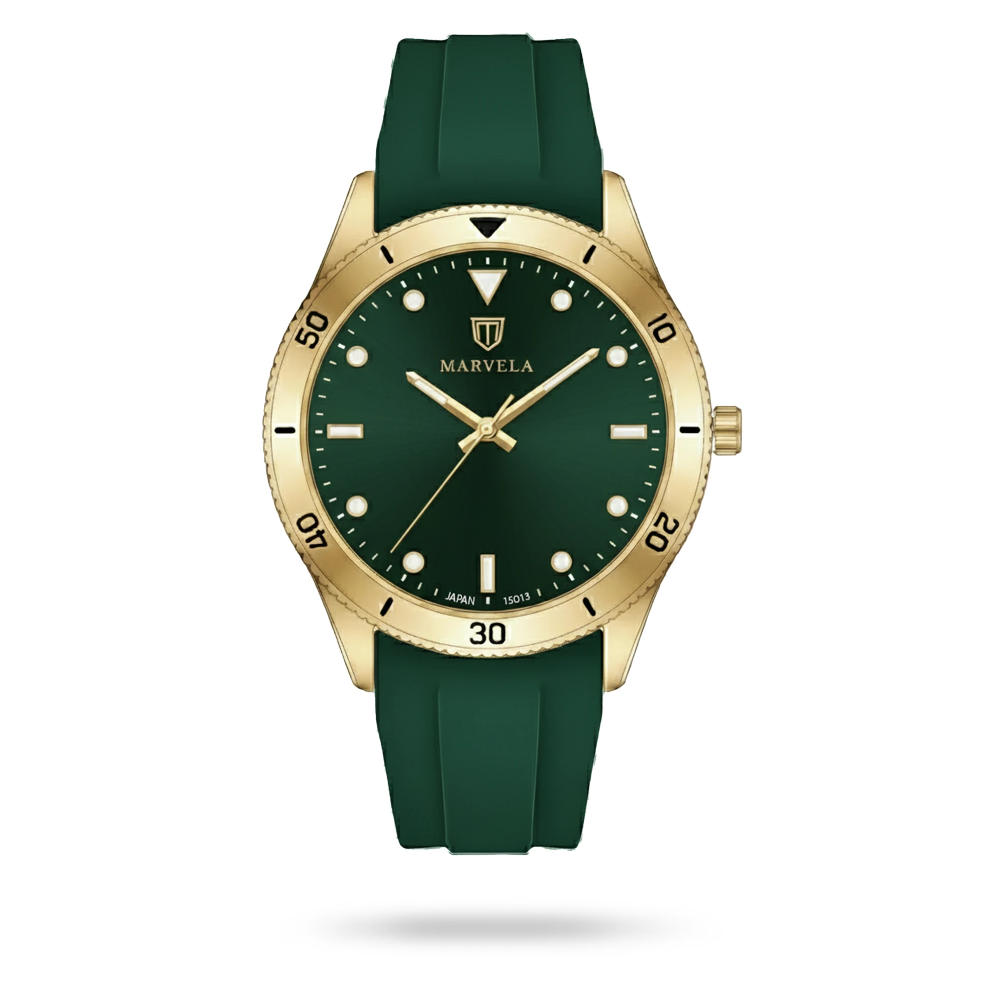 Marvela Watch For Men code MR13011G-0107 ,a beautiful wrist watch with 13011 Reference, is a Sport watch which has a Rubber Strap, gives you an unique style. This watch has a Golden case, Green strap and a Green dial which has created a beautiful color combination.