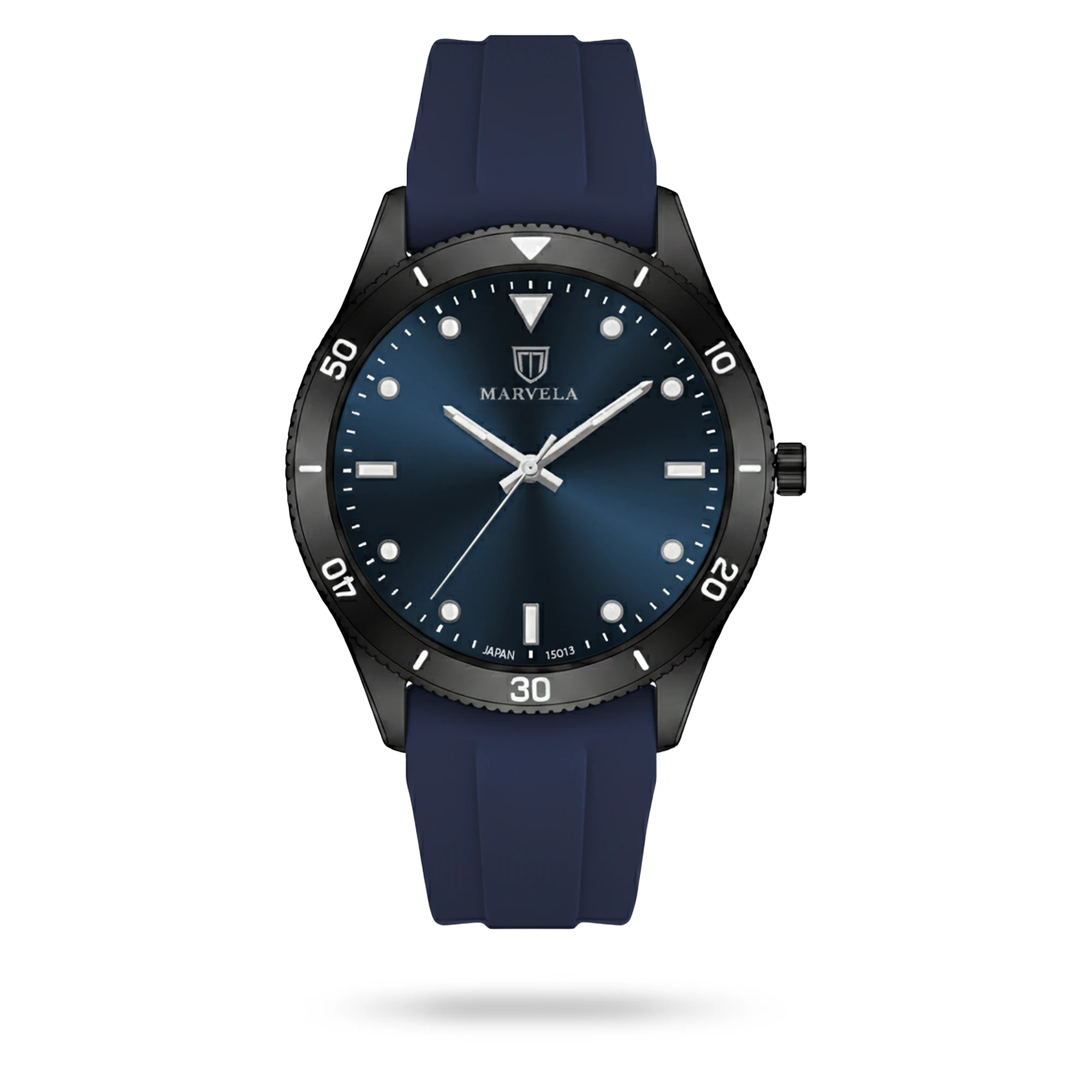 Marvela Watch For Men code MR13011G-0880 ,a beautiful wrist watch with 13011 Reference, is a Sport watch which has a Rubber Strap, gives you an unique style. This watch has a Smoke case, Dark Blue strap and a Dark Blue dial which has created a beautiful color combination.