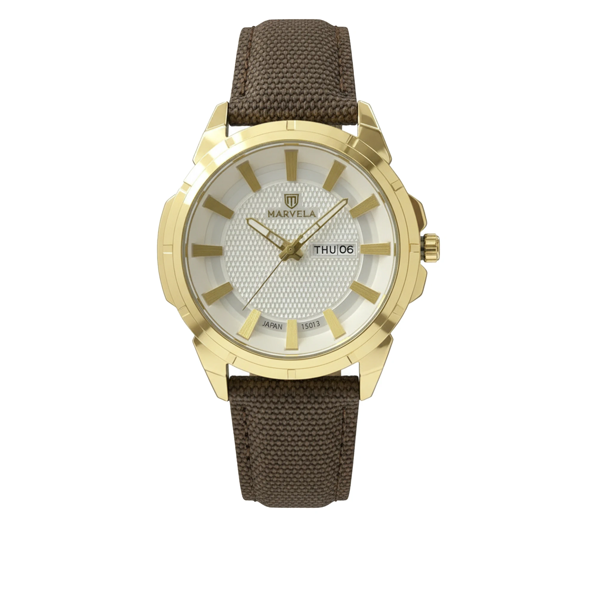 Marvela Watch For Men code MR15013G-0001 ,a beautiful wrist watch with 15013 Reference, is a Casual watch which has a Tarpaulin Strap, gives you an unique style. This watch has a Golden case, Brown strap and a Silver dial which has created a beautiful color combination.