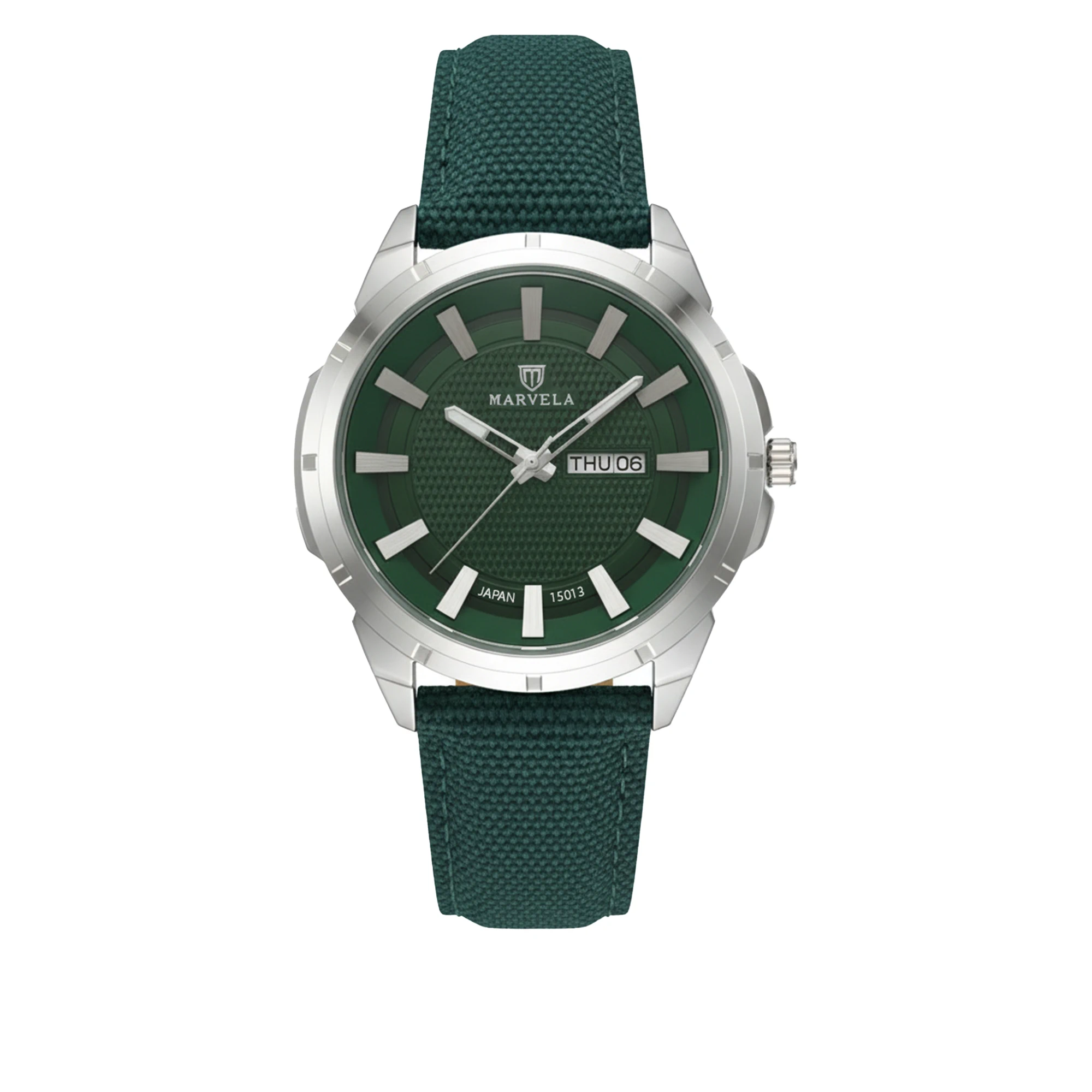 Marvela Watch For Men code MR15013G-0009 ,a beautiful wrist watch with 15013 Reference, is a Casual watch which has a Tarpaulin Strap, gives you an unique style. This watch has a Steel case, Green strap and a Green dial which has created a beautiful color combination.