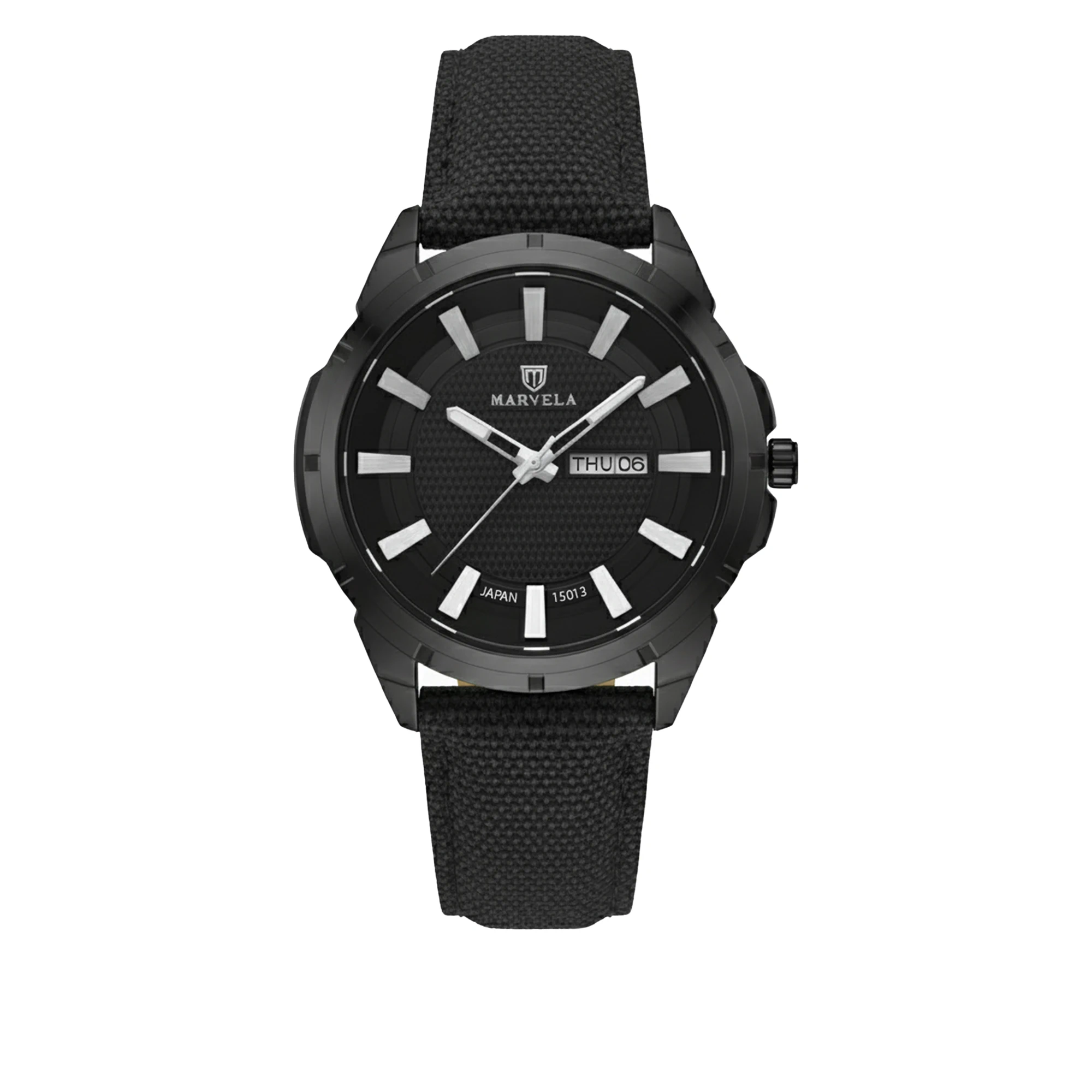 Marvela Watch For Men code MR15013G-0014 ,a beautiful wrist watch with 15013 Reference, is a Casual watch which has a Tarpaulin Strap, gives you an unique style. This watch has a Black case, Black strap and a Black dial which has created a beautiful color combination.