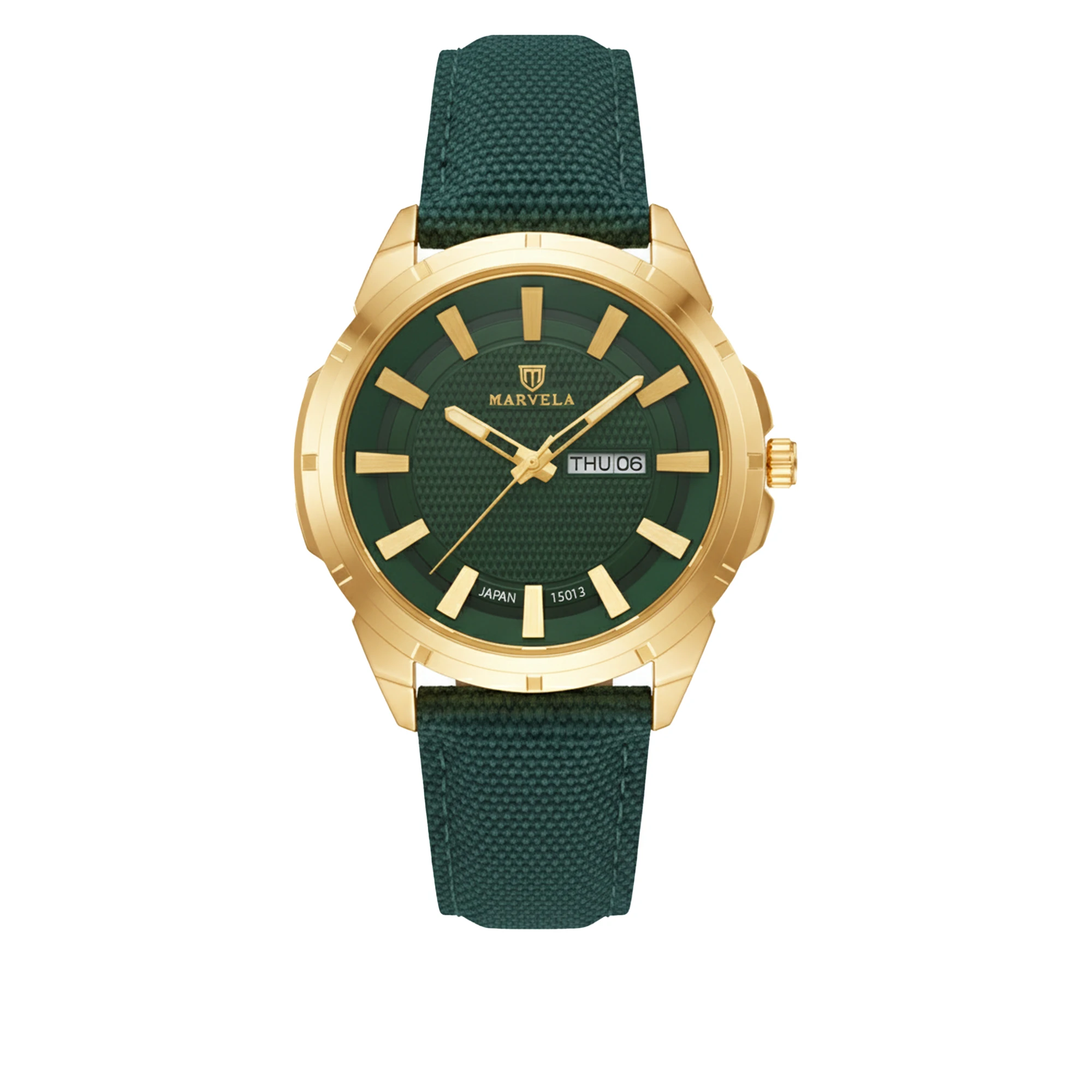 Marvela Watch For Men code MR15013G-0042 ,a beautiful wrist watch with 15013 Reference, is a Casual watch which has a Tarpaulin Strap, gives you an unique style. This watch has a Golden case, Green strap and a Green dial which has created a beautiful color combination.