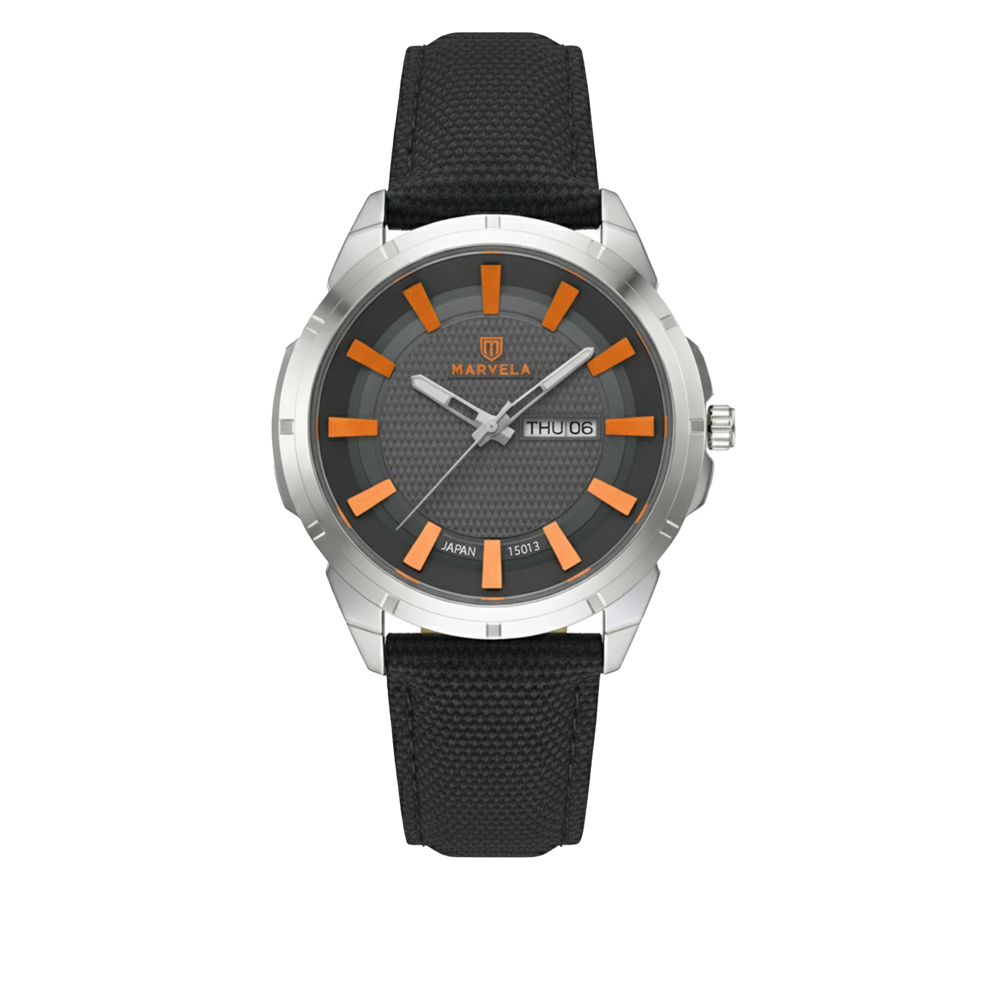 Marvela Watch For Men code MR15013G-1024 ,a beautiful wrist watch with 15013 Reference, is a Casual watch which has a Tarpaulin Strap, gives you an unique style. This watch has a Smoke case, Black strap and a Gray Orange dial which has created a beautiful color combination.