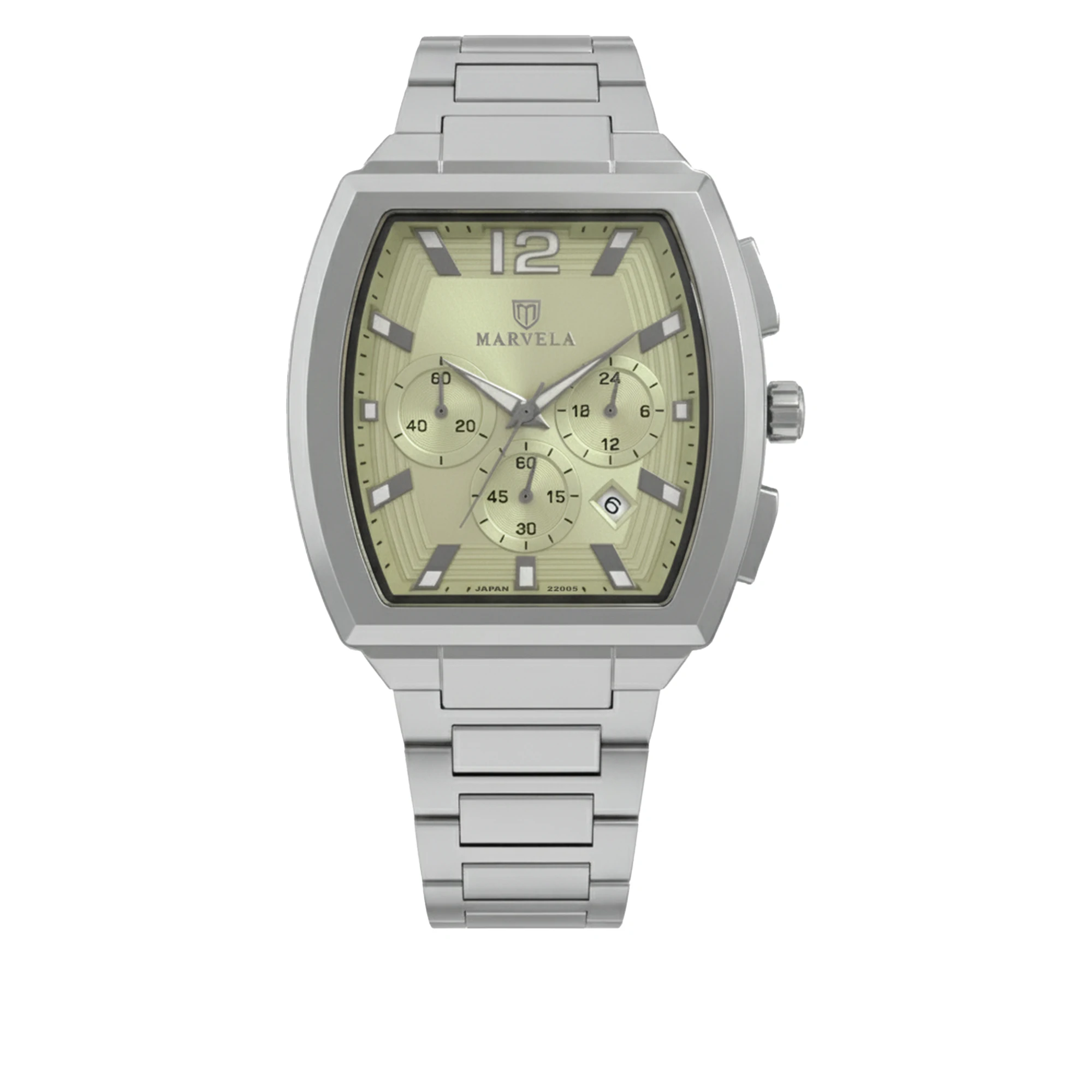 Marvela Watch For Men code MR22005G-0863 ,a beautiful wrist watch with 22005 Reference, is a Chronograph watch which has a Metallic Strap, gives you an unique style. This watch has a Steel case, Steel strap and a Pistachio dial which has created a beautiful color combination.
