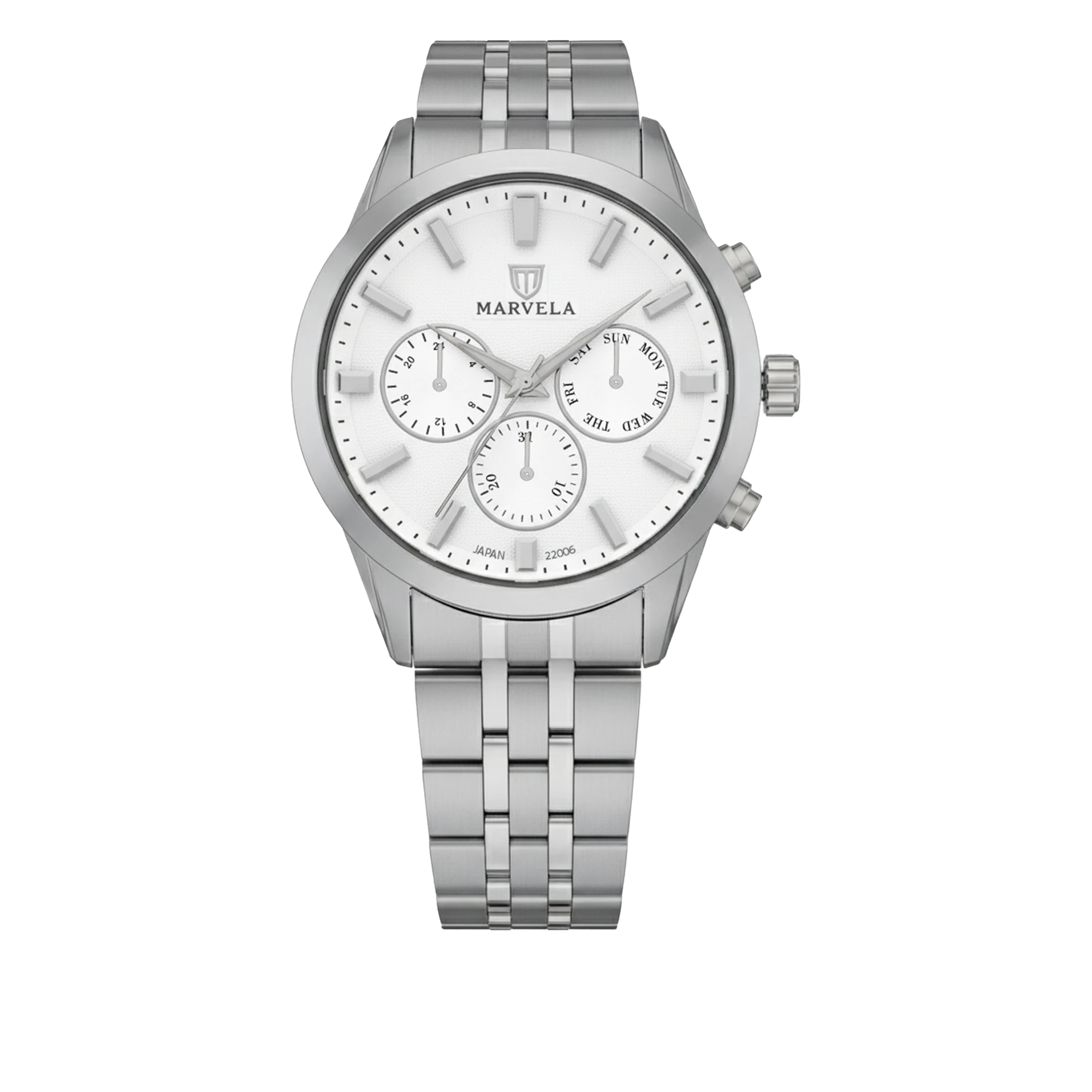 Marvela Watch For Men code MR22006G-0004 ,a beautiful wrist watch with 22006 Reference, is a Chronograph watch which has a Metallic Strap, gives you an unique style. This watch has a Steel case, Steel strap and a Silver dial which has created a beautiful color combination.