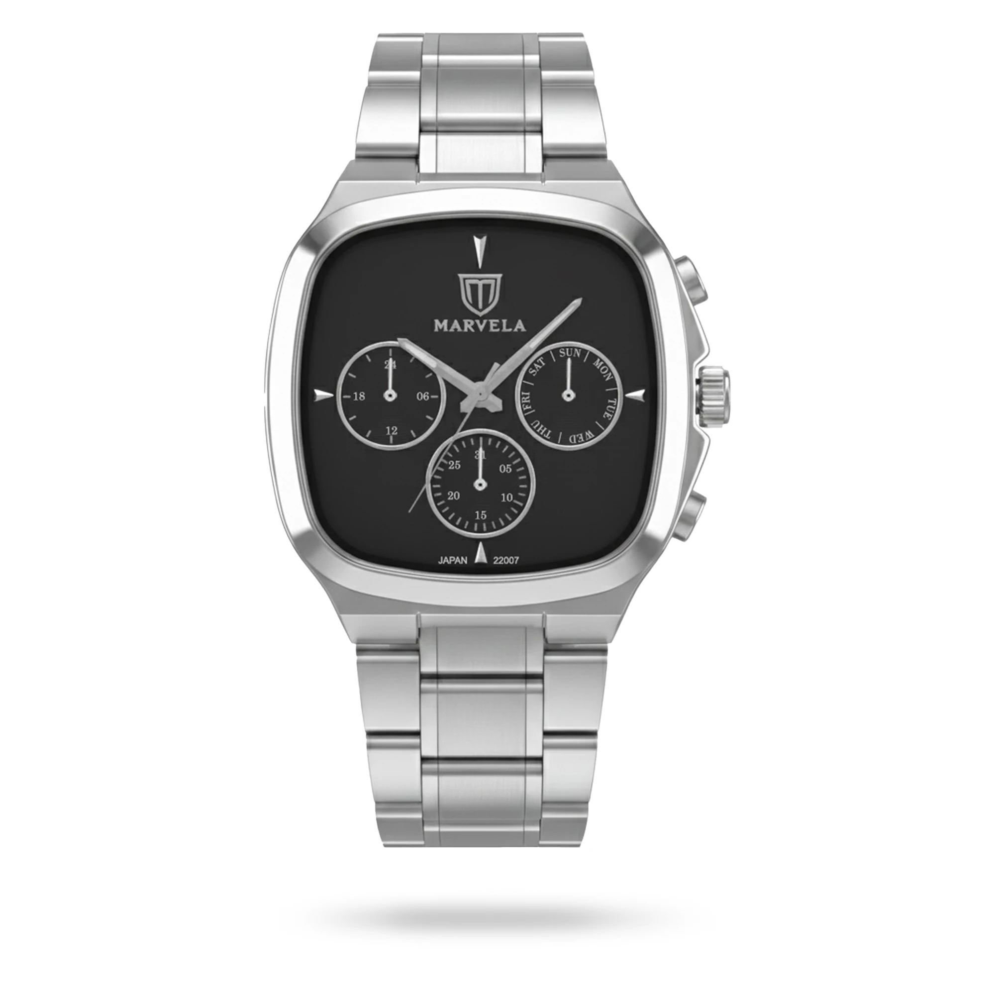 Marvela Watch For Men code MR22007G-0005 ,a beautiful wrist watch with 22007 Reference, is a Chronograph watch which has a Metallic Strap, gives you an unique style. This watch has a Steel case, Steel strap and a Black dial which has created a beautiful color combination.