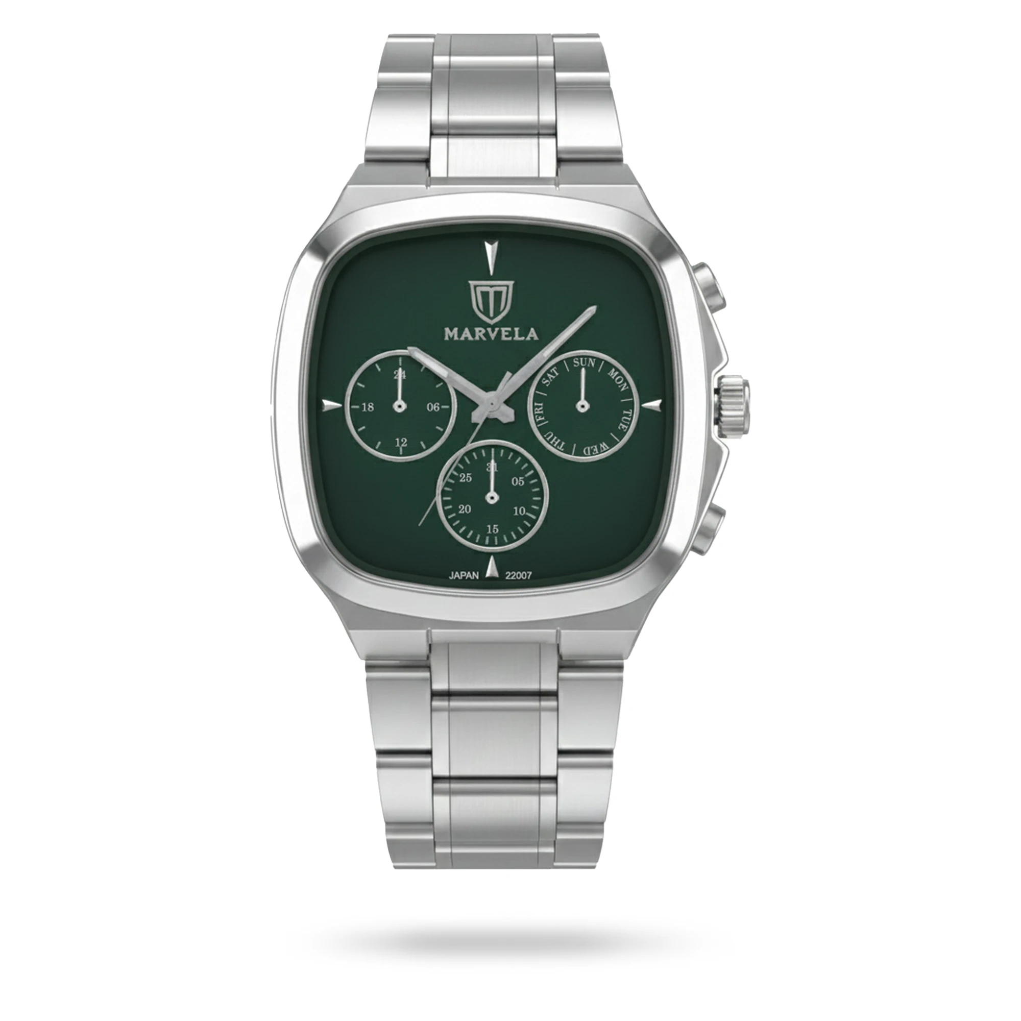 Marvela Watch For Men code MR22007G-0009 ,a beautiful wrist watch with 22007 Reference, is a Chronograph watch which has a Metallic Strap, gives you an unique style. This watch has a Steel case, Steel strap and a Green dial which has created a beautiful color combination.