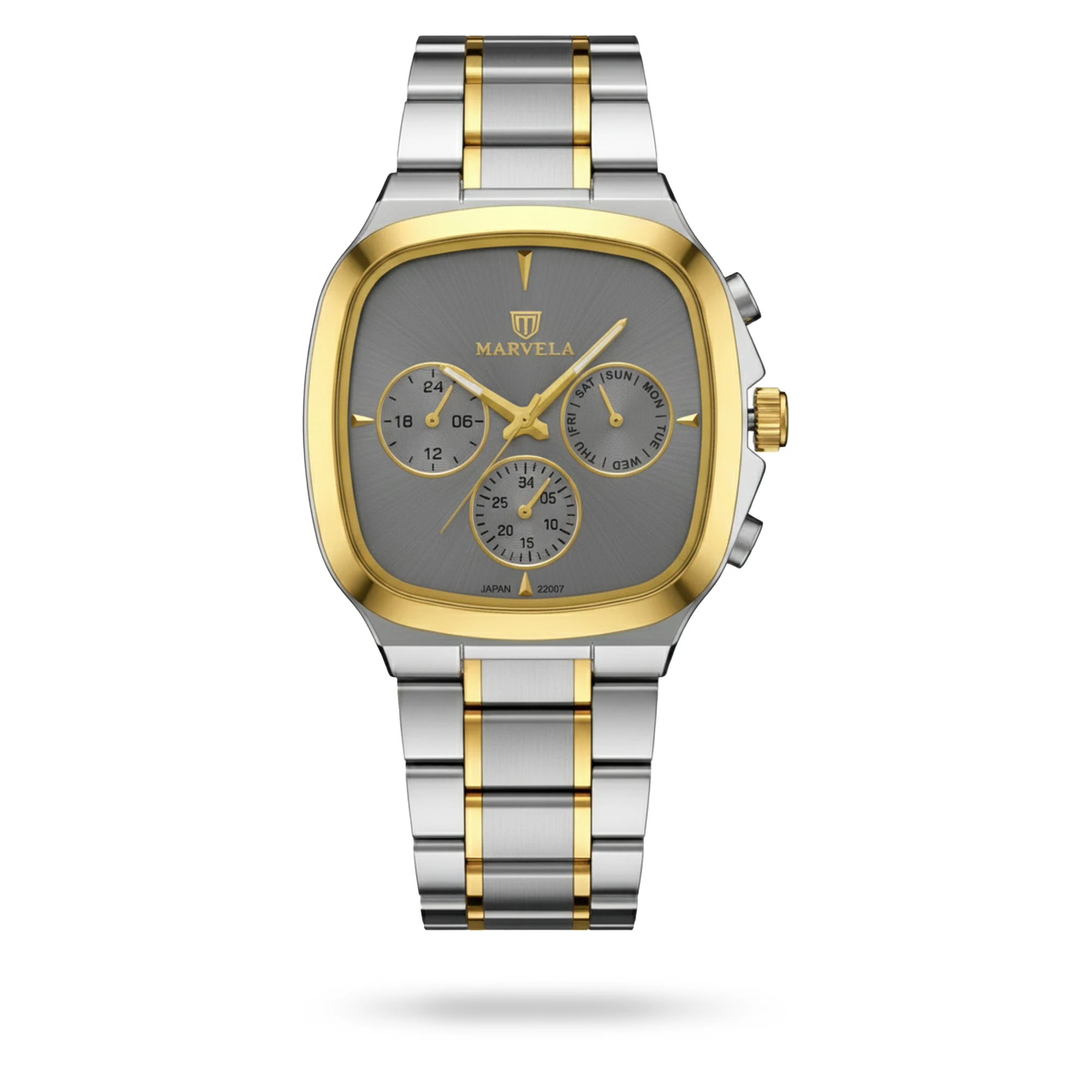 Marvela Watch For Men code MR22007G-0017 ,a beautiful wrist watch with 22007 Reference, is a Chronograph watch which has a Metallic Strap, gives you an unique style. This watch has a Golden Steel case, Golden Steel strap and a Gray dial which has created a beautiful color combination.