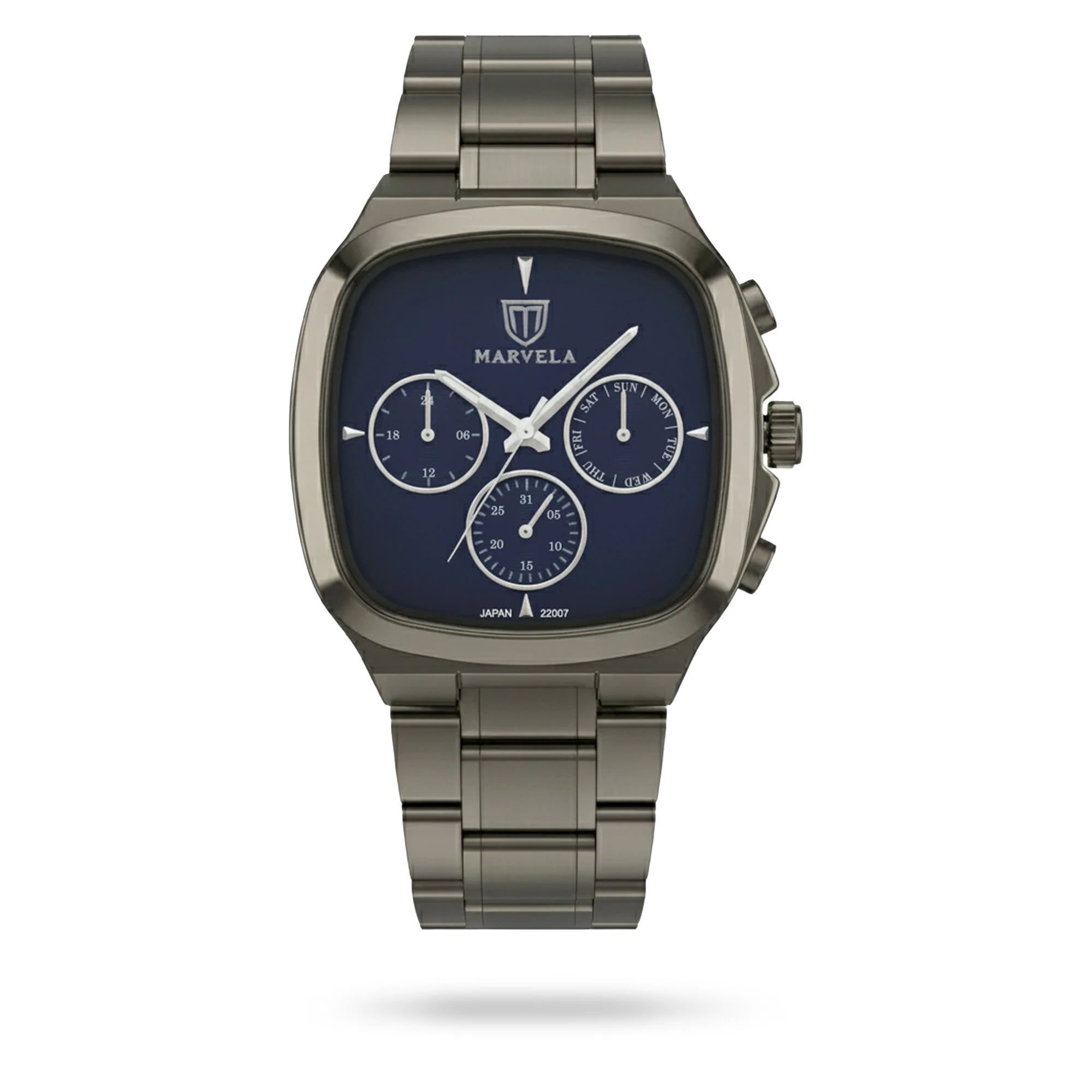 Marvela Watch For Men code MR22007G-0302 ,a beautiful wrist watch with 22007 Reference, is a Chronograph watch which has a Metallic Strap, gives you an unique style. This watch has a Smoke case, Smoke strap and a Dark Blue dial which has created a beautiful color combination.