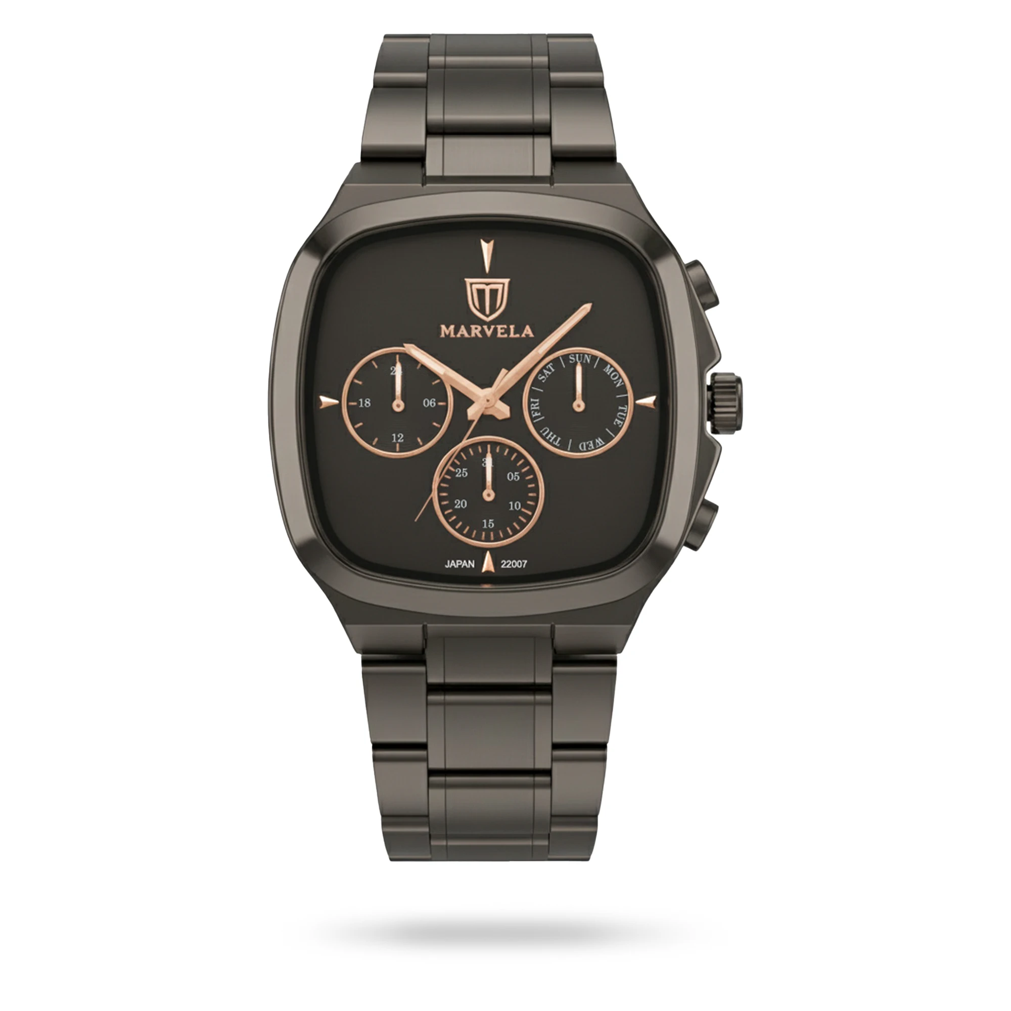 Marvela Watch For Men code MR22007G-1024 ,a beautiful wrist watch with 22007 Reference, is a Chronograph watch which has a Metallic Strap, gives you an unique style. This watch has a Smoke case, Smoke strap and a Smoke dial which has created a beautiful color combination.