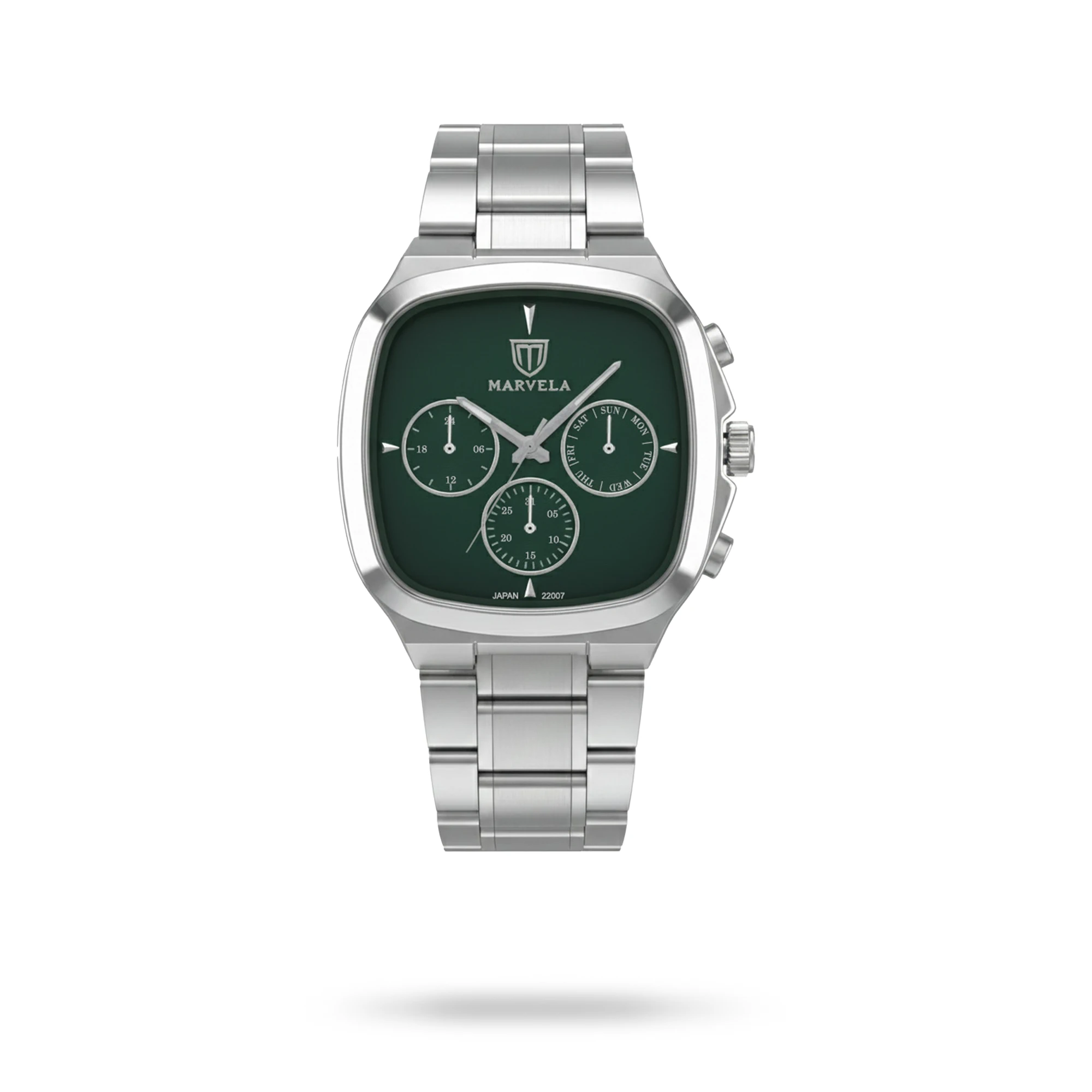 Marvela Watch For Women code MR22007L-0009 ,a beautiful wrist watch with 22007 Reference, is a Chronograph watch which has a Metallic Strap, gives you an unique style. This watch has a Steel case, Steel strap and a Green dial which has created a beautiful color combination.