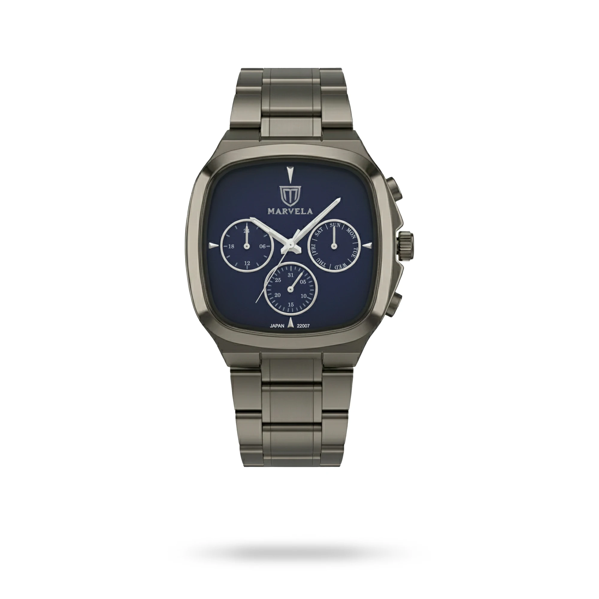 Tags: 22007 Reference, Chronograph Watch, Dark Blue Dial, Metallic Strap, Smoke Case, Smoke Strap