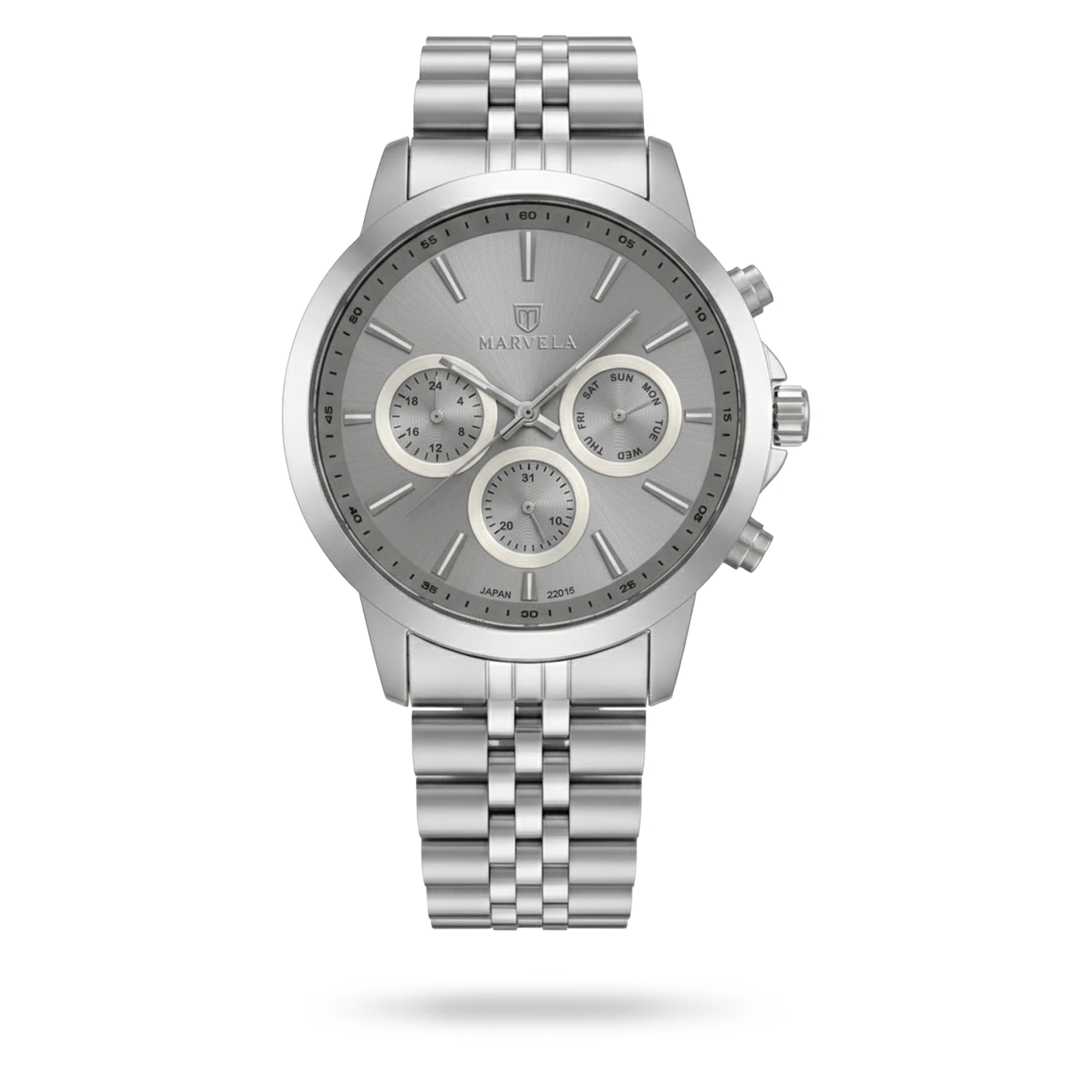 Marvela Watch For Men code MR22015G-0025 ,a beautiful wrist watch with 22015 Reference, is a Chronograph watch which has a Metallic Strap, gives you an unique style. This watch has a Steel case, Steel strap and a Gray dial which has created a beautiful color combination.