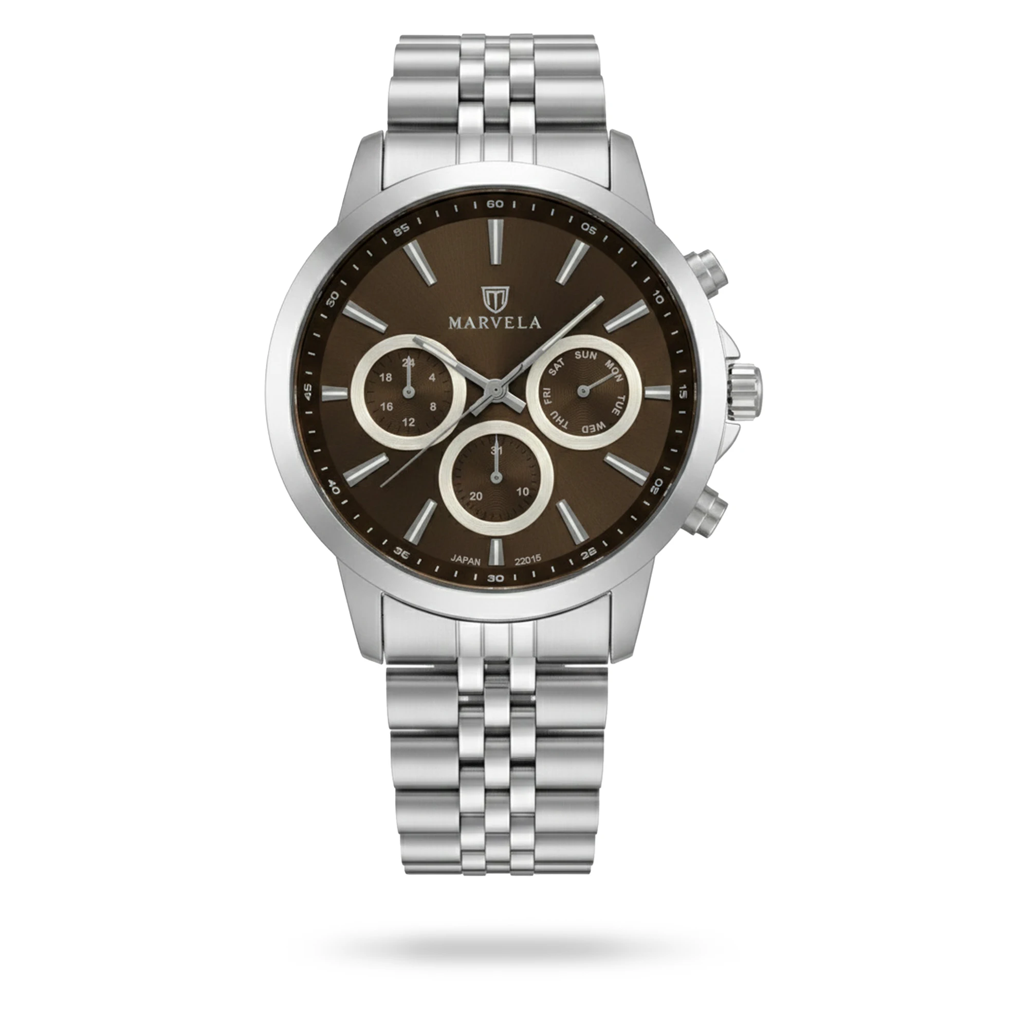 Marvela Watch For Men code MR22015G-0102 ,a beautiful wrist watch with 22015 Reference, is a Chronograph watch which has a Metallic Strap, gives you an unique style. This watch has a Steel case, Steel strap and a Brown dial which has created a beautiful color combination.