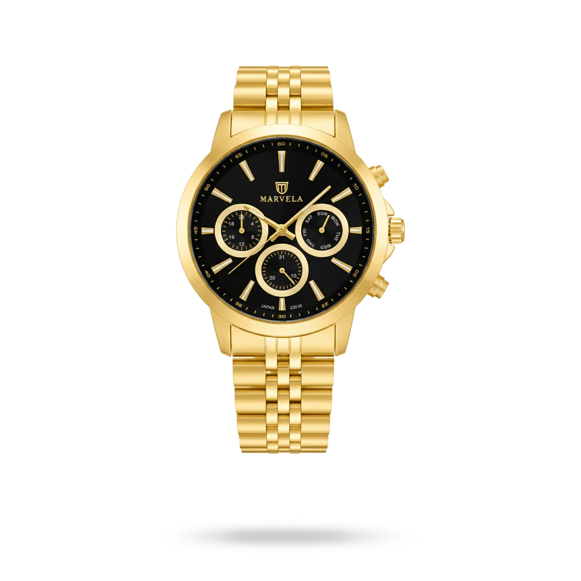 Marvela Watch For Women code MR22015L-0002 ,a beautiful wrist watch with 22015 Reference, is a Chronograph watch which has a Metallic Strap, gives you an unique style. This watch has a Golden case, Golden strap and a Black dial which has created a beautiful color combination.