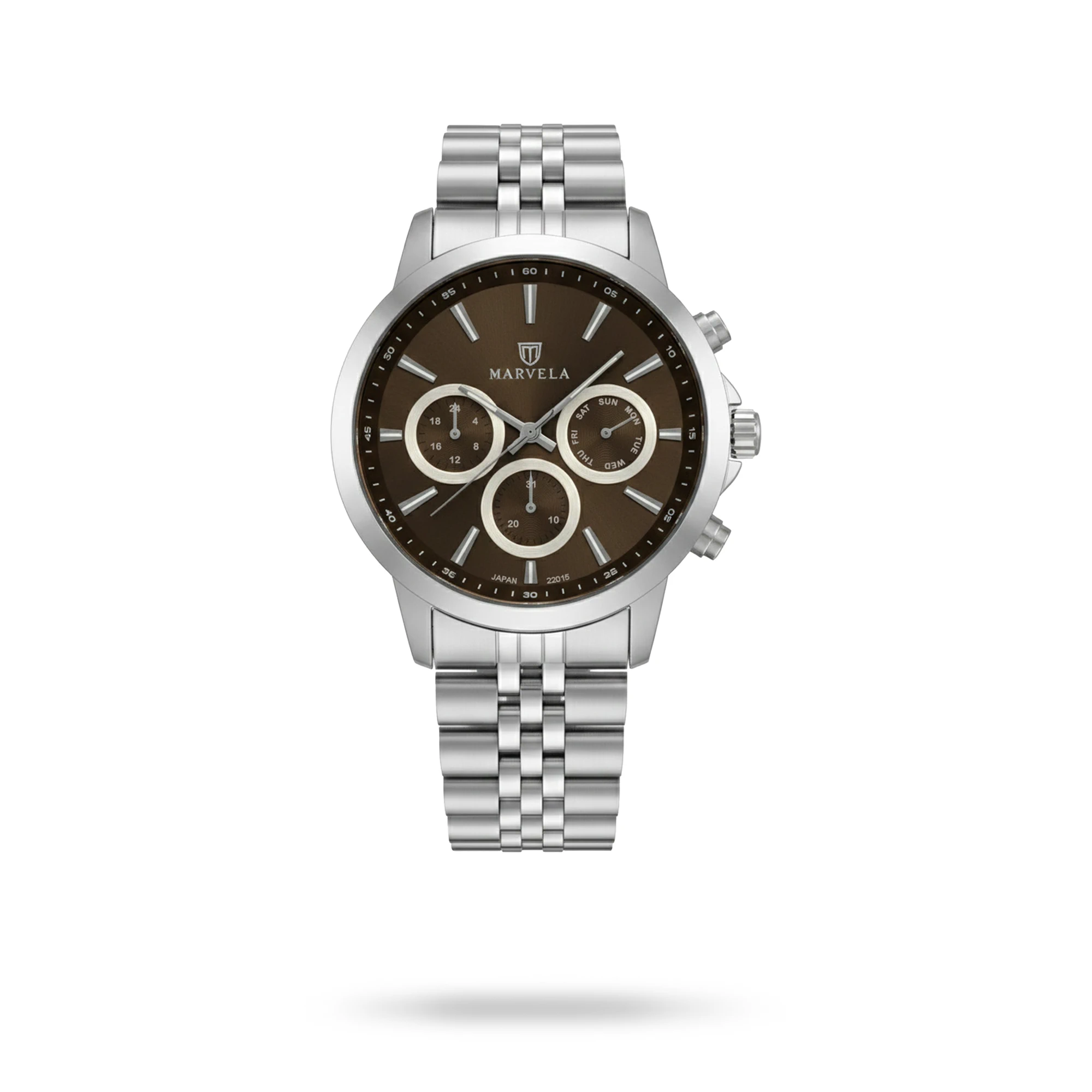Marvela Watch For Women code MR22015L-0102 ,a beautiful wrist watch with 22015 Reference, is a Chronograph watch which has a Metallic Strap, gives you an unique style. This watch has a Steel case, Steel strap and a Brown dial which has created a beautiful color combination.