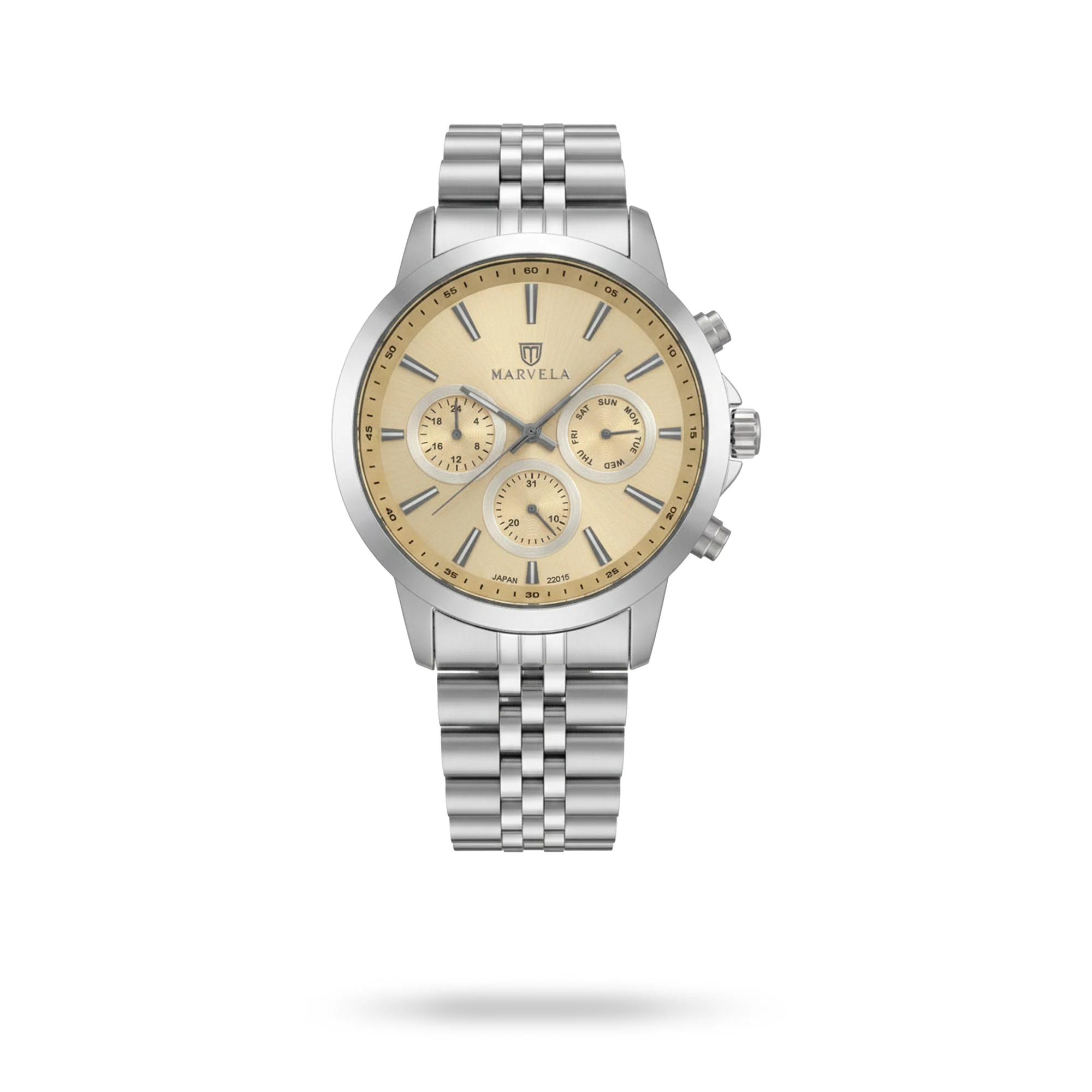 Marvela Watch For Women code MR22015L-0301 ,a beautiful wrist watch with 22015 Reference, is a Chronograph watch which has a Metallic Strap, gives you an unique style. This watch has a Steel case, Steel strap and a Champagne dial which has created a beautiful color combination.