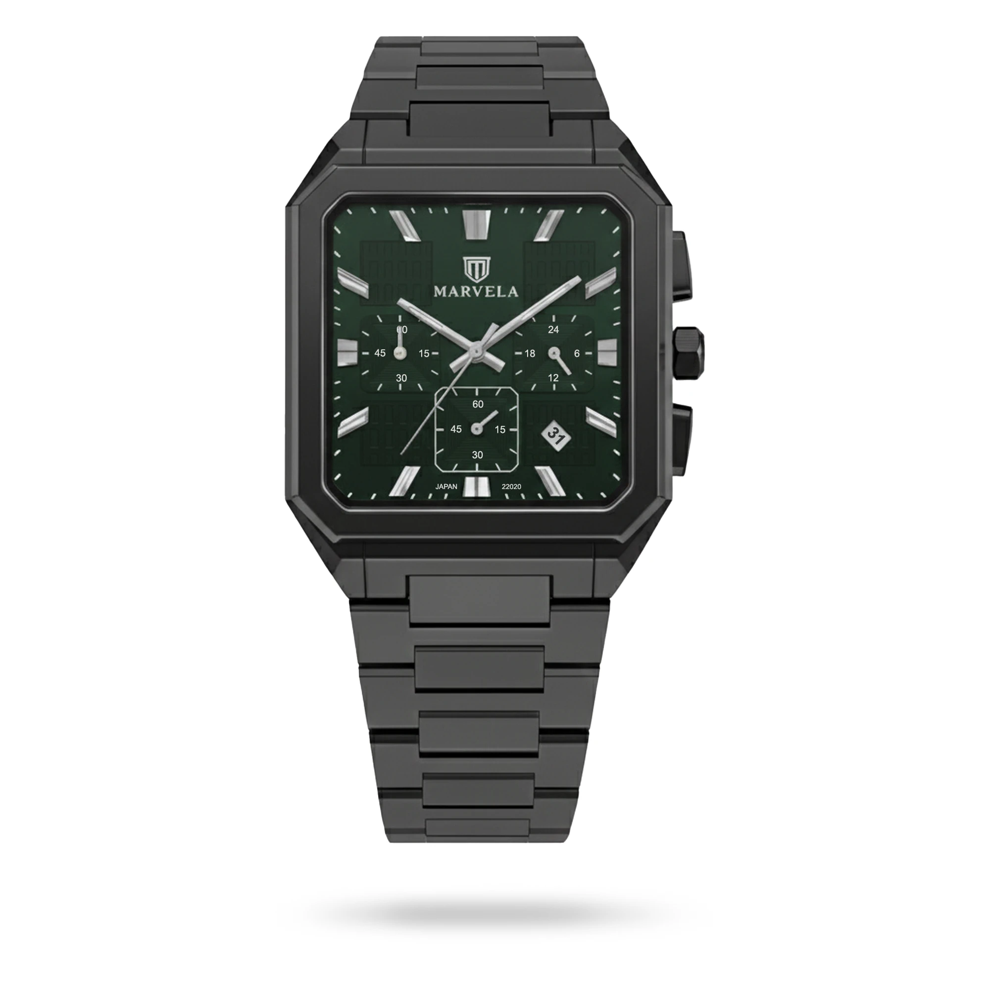 Marvela Watch For Men code MR22020G-0027 ,a beautiful wrist watch with 22020 Reference, is a Chronograph watch which has a Metallic Strap, gives you an unique style. This watch has a Black case, Black strap and a Green dial which has created a beautiful color combination.