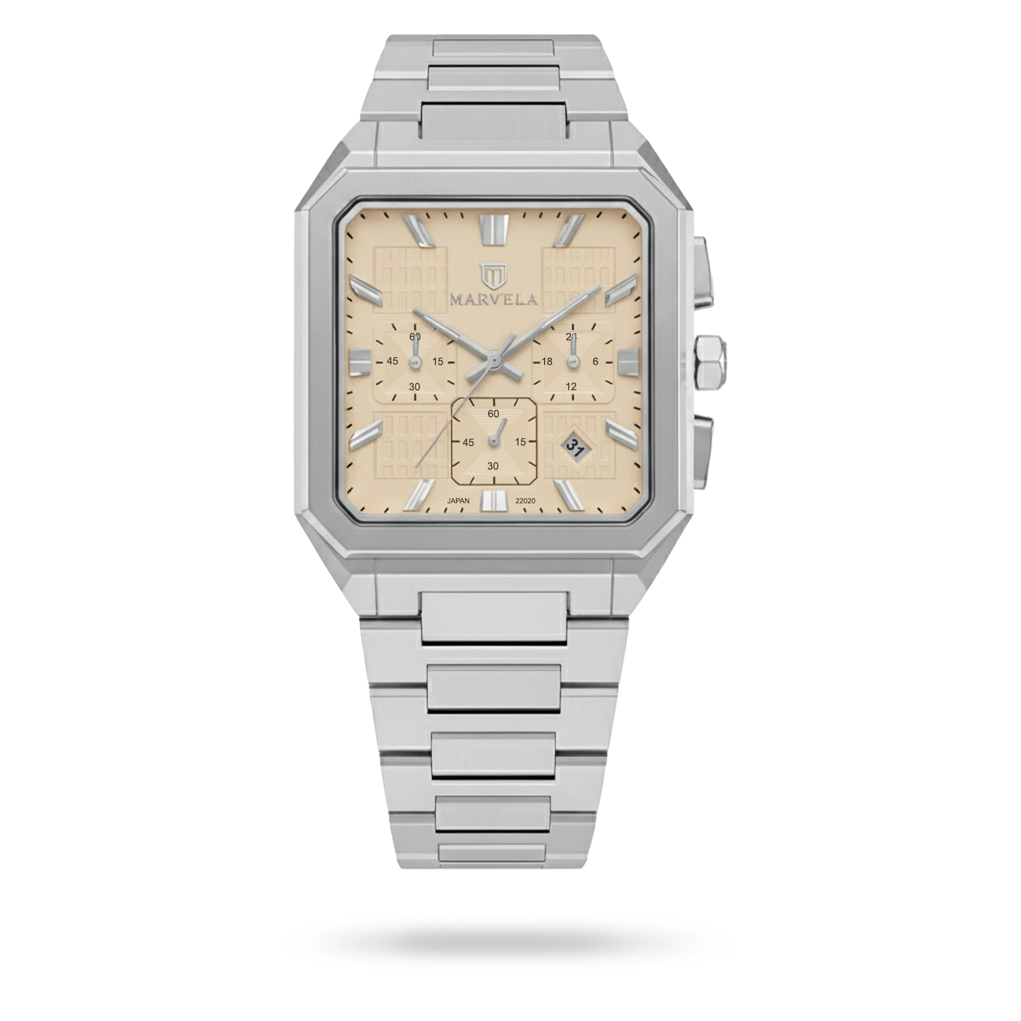 Marvela Watch For Men code MR22020G-0301 ,a beautiful wrist watch with 22020 Reference, is a Chronograph watch which has a Metallic Strap, gives you an unique style. This watch has a Steel case, Steel strap and a Yellow dial which has created a beautiful color combination.