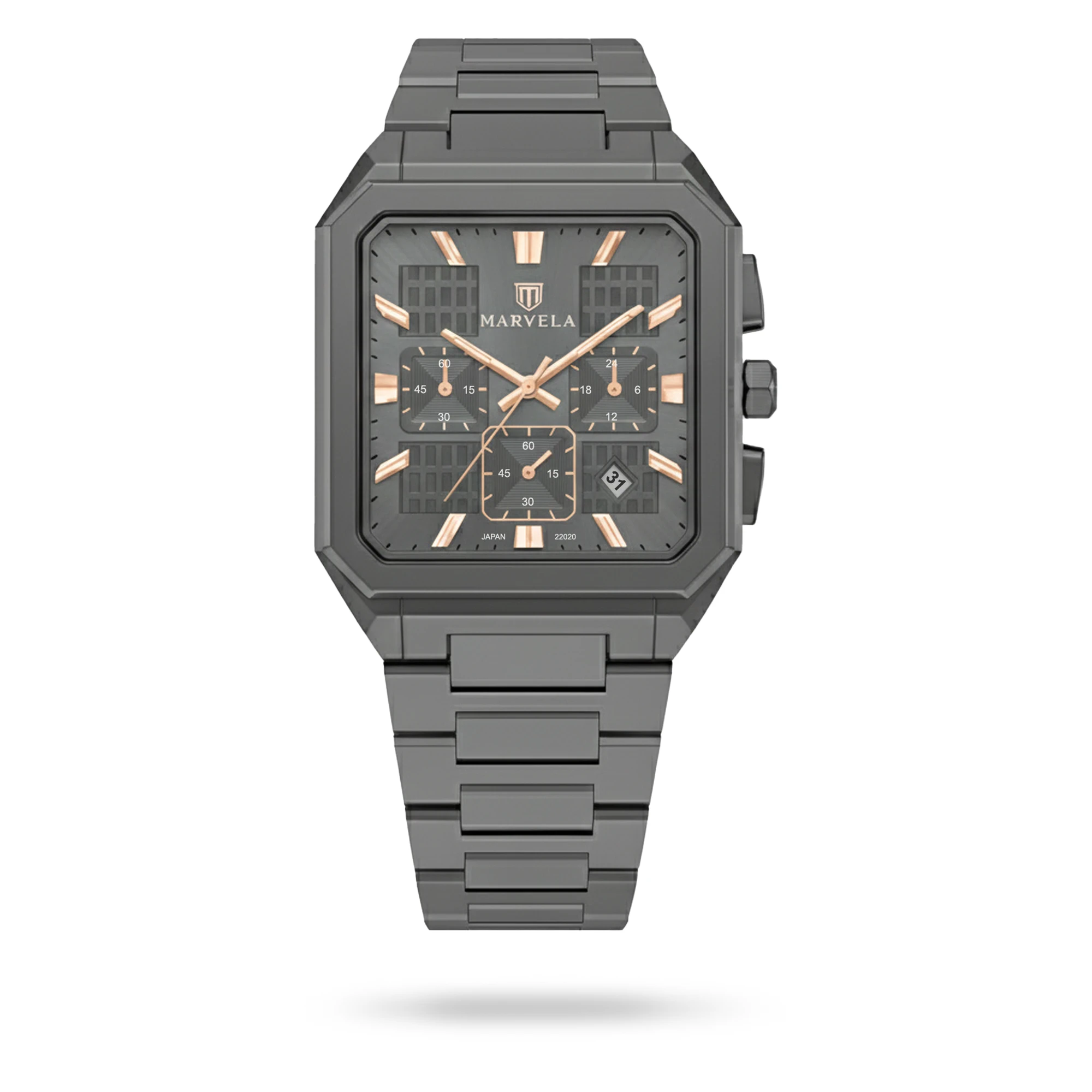 Marvela Watch For Men code MR22020G-1024 ,a beautiful wrist watch with 22020 Reference, is a Chronograph watch which has a Metallic Strap, gives you an unique style. This watch has a Smoke case, Smoke strap and a Smoke dial which has created a beautiful color combination.
